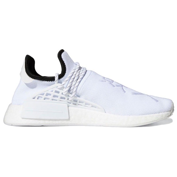 The adidas NMD Hu Pharrell Extra Eye White is dressed in two major hues: cloud white and core black. The greater majority of the color scheme on this collaborative sneaker by Pharrell and adidas is white. A smaller tone of black hue can be spotted on this shoe, particularly on the ankle collar lining and on the laces. There is also a visible Human Race branding inscription written in Chinese on the forefoot of this sneaker. The adidas NMD Hu Pharrell Extra Eye White had a suggested retail price of $220 when it first debuted in the market on September 19th, 2020.