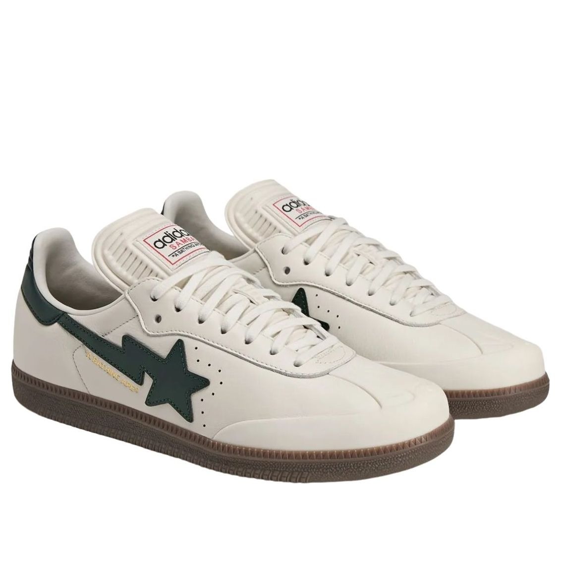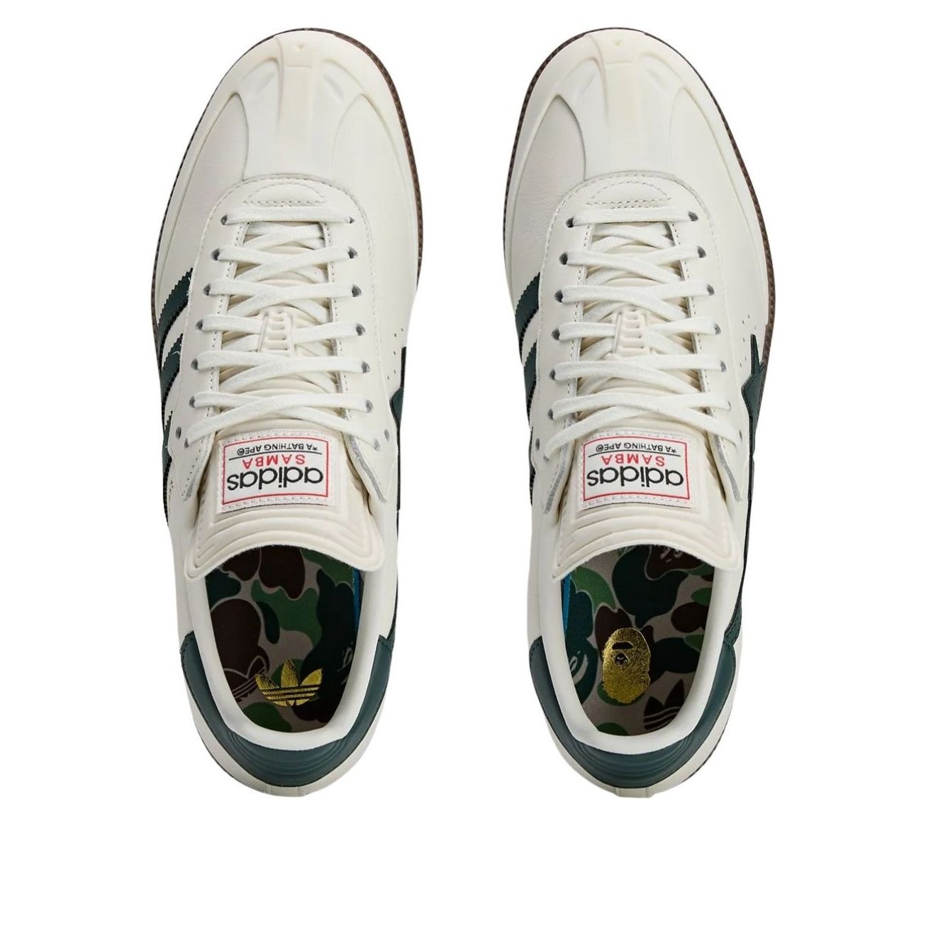 The adidas Samba Bape World Cup Pack White Forest features a Cream White/Forest Night/Gum colorway. This adidas Samba was first released for $160 on February 07, 2026.