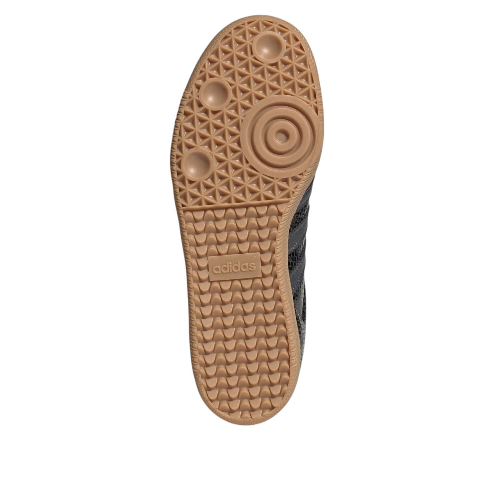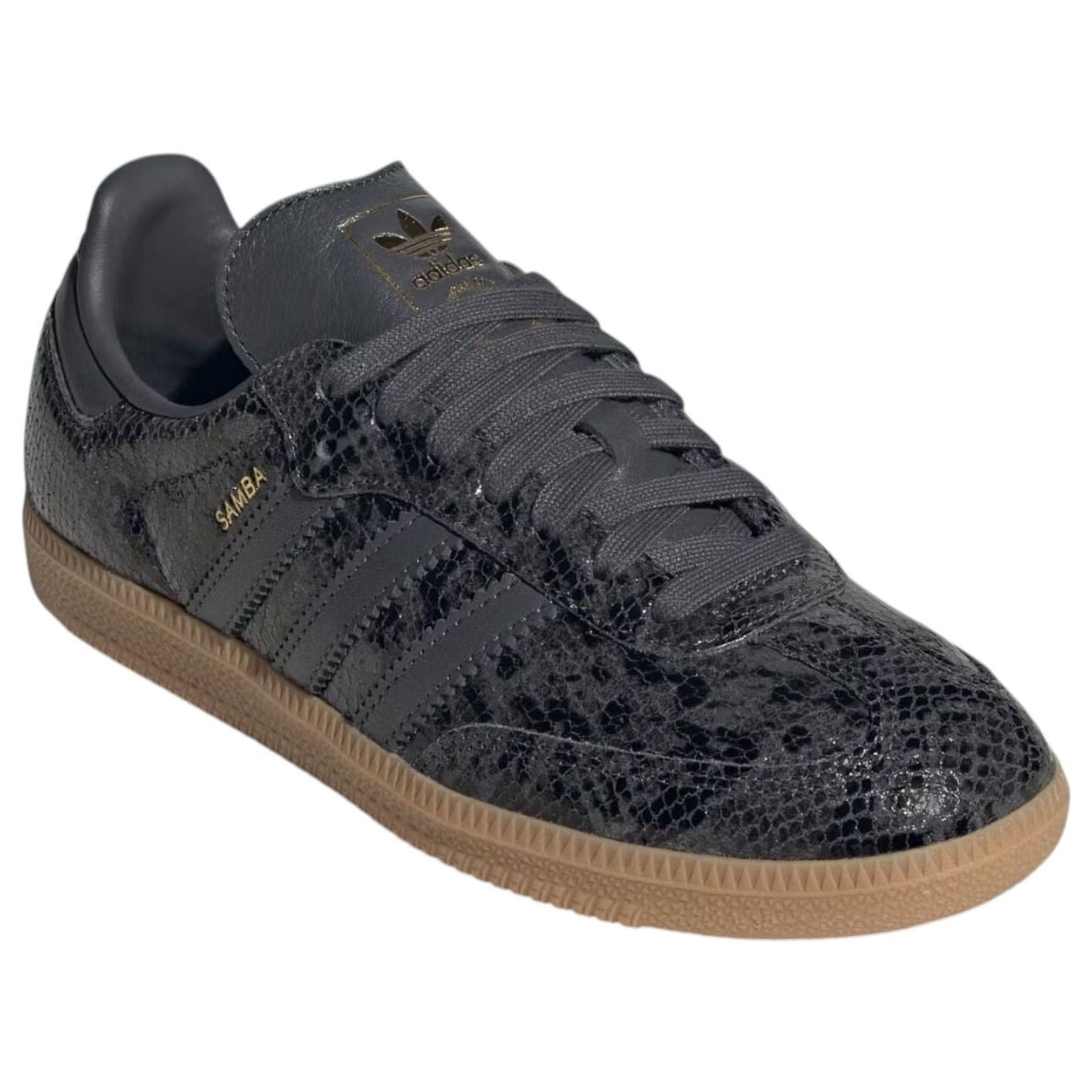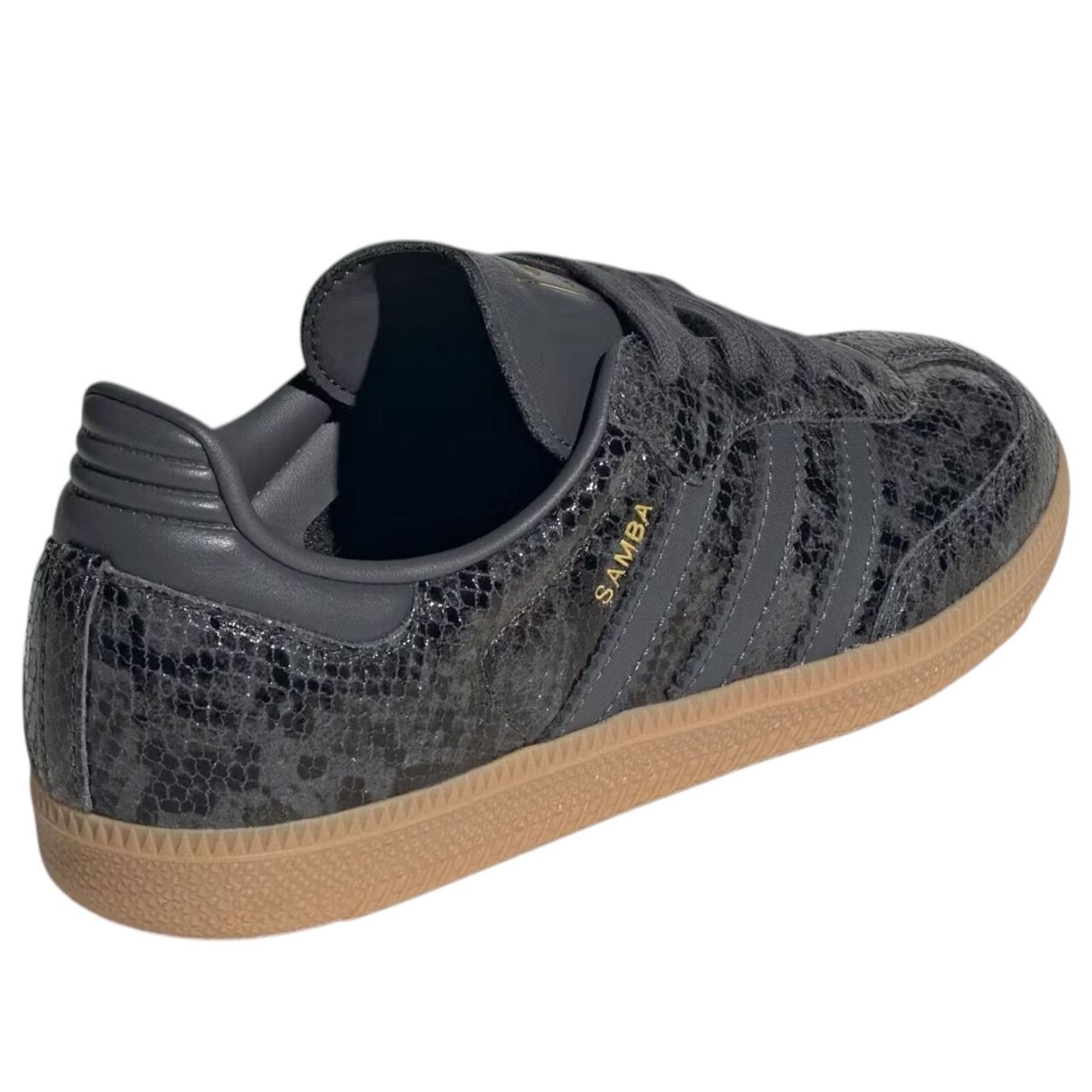 The adidas Samba OG Snakeskin Black Womens reinterprets a terrace icon through texture and attitude while staying true to its classic proportions. Core black anchors the upper, while subtle snakeskin detailing adds dimension that feels refined rather than flashy. Grey six accents provide contrast across the familiar stripe placement, and the gum sole keeps the silhouette grounded in its indoor football roots. The result feels sleek and elevated without losing the simplicity that defines the Samba. Fans appreciate this version because it pushes material rather than color. The snakeskin finish gives the shoe personality while maintaining everyday wearability, making it appealing to collectors who value subtle distinction. The Samba OG continues to thrive through thoughtful updates like this, where texture adds depth without compromising heritage. It stands as a confident evolution of a timeless design, blending street credibility with understated sophistication in a way that feels natural and lasting. The adidas Samba OG Snakeskin Black Womens was released on September 1, 2025 with a retail price of $100.