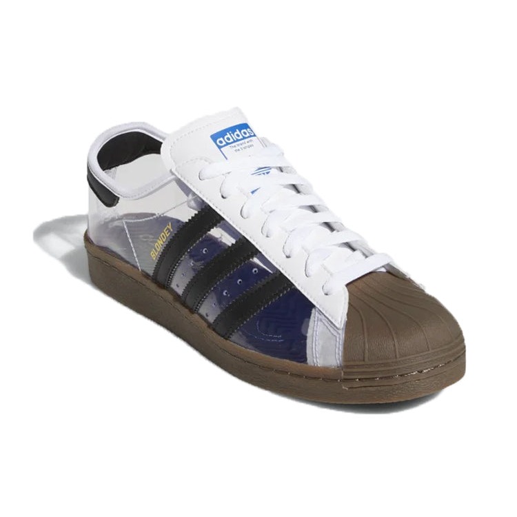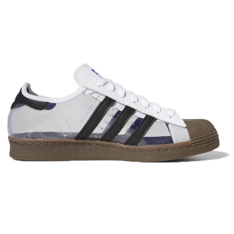 adidas and McCoy give the Superstar 80s an update by fusing Superstar DNA with a translucent PVC upper on the adidas Superstar 80 Blondey McCoy. The sneakers sit atop a gum outsole with three-stripe styling and branding. The Superstar 80 Blondey McCoy sports a translucent PVC upper, revealing the color of the sock youve chosen. To provide contrast, three black synthetic leather stripes appear on the medial and lateral walls next to the Blondey inscription. White laces, a white vamp, and a white ankle entry complement the see-through shell which sits on a gum outsole crafted from rubber. The outsole has herringbone patterns underfoot for increasing traction on different surfaces. What our experts love about the adidas Superstar 80 Blondey McCoy is the translucent take on the classic silhouette. The see-through motif allows you to style these sneakers with any Adidas originals socks and theyll attract attention every darn time. The shoe was released on December 14, 2019, retailing for $100.