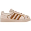 Designed to replicate pan dulce, the adidas Superstar Concha Strawberry is an eye-catching shoe that exudes style and delivers indulgent comfort with every step. Along with a vanilla and chocolate release, this strawberry release celebrates the flavorful Mexican sweet bread.The upper of this strawberry pan dulce iteration of the classic adidas Superstar silhouette is fashioned of a pale-pink, Sherpa-like material that gives the shoe a soft, fuzzy texture. Gold embroidery forms piping across the upper, as well as the iconic side-panel 3-Stripes. Flat, pale-pink laces help ensure a snug closure over a branded tongue. Gold-embroidered adidas trefoil branding hits the heel, and gold Superstar branding accents the outer side panel. The pale-pink sole unit features an outsole with a classic herringbone traction pattern.The standout detail of this sneaker that we most enjoy is the gold embroidery on the toe box that recreates the look of the pan dulce bread itself, making these sneakers look good enough to eat. The adidas Superstar Concha Strawberry was released on May 18, 2023, for $135 retail.