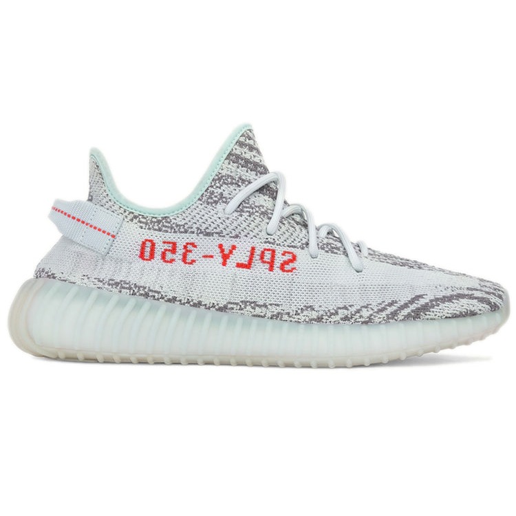 In a similar pattern to the renowned adidas Yeezy Boost 350 V2 Zebra, the adidas Yeezy Boost 350 V2 Blue Tint features a marbled grey Primeknit upper with a light grey side stripe that is decorated with bright red SPLY-350 text. At the base, a Blue Tint semi-translucent Boost sole adds cushioning and support. The adidas Yeezy Boost 350 V2 Blue Tint originally released in December of 2017, and restocked in January of 2022 at a retail price of $220.