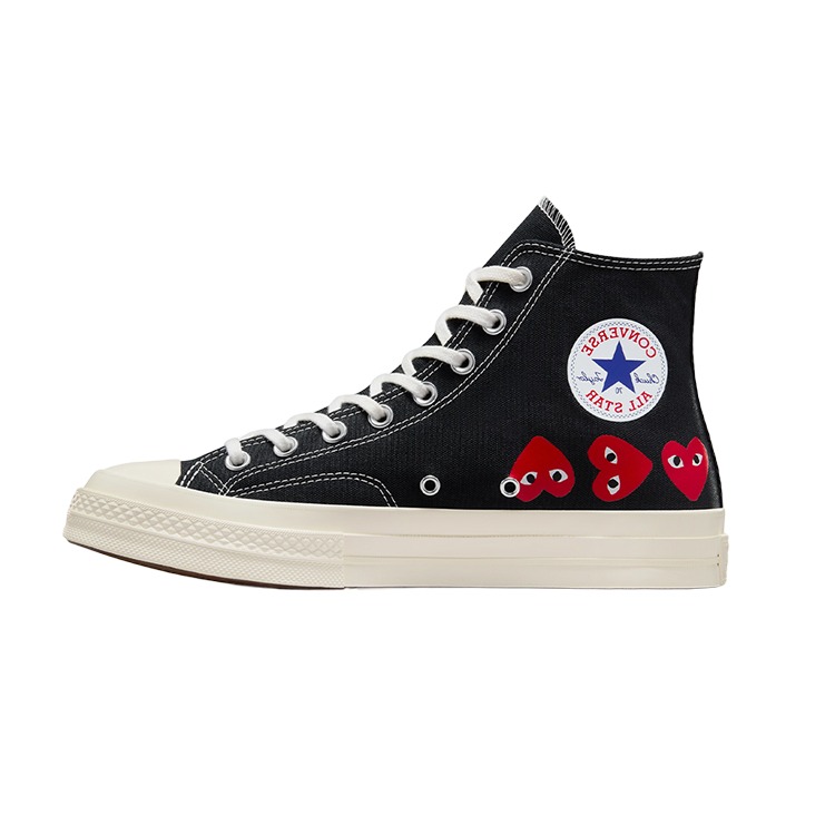 The Converse Chuck Taylor All Star 70 Hi Comme des Garcons PLAY Multi-Heart Black is part of the creative partnership of Converse and Comme des Garcons, a Tokyo-based streetwear label sought after for its deconstructed aesthetic and monochromatic colorways.The sneaker takes the Chuck Taylor All Star 70 Hi silhouette and applies Comme des Garcons signature heart motifs to the black canvas upper. Each heart comes with eyes and features a bright red hue. Six hearts form a line above the rubber outsole on the later side, while the medial side panel only displays three hearts and the Converse All Star logo. The sneaker features seven pairs of metal eyelets that house off-white laces.Our Newsole experts appreciate the contrasting stitching on the upper, which comes in white thread. The Converse Chuck Taylor All Star 70 Hi Comme des Garcons PLAY Multi-Heart Black was launched on October 26th, 2023, and sold for $150.