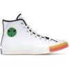 Converse Chuck Taylor All Star Leather Raygunincorporates a cross-brand design theme, drawing inspiration from a 2002 Nike Basketball promotional campaign with its mesmerizing color scheme and intricate details.The Converse Chuck exudes a bold and stylish appeal with its high-top design, capturing the essence of the classic Chuck 70 silhouette. Its leather upper is adorned with eye-catching Raygun graphics, creating a distinct and vibrant look. The shoe’s color scheme and intricate details are a testament to the brand’s commitment to innovative cross-brand designs. The white base provides a clean canvas for the vibrant orange and yellow accents, giving the shoe a dynamic and eye-catching appearance. The shoe incorporates modern cushioning and support features, ensuring a comfortable and enjoyable wearing experience.what our expert team loves about the Converse Chuck Taylor is its captivating cross-brand design theme. This unique cross-brand design brings a nostalgic touch while maintaining the classic Chuck 70 silhouette. The Converse Chuck Taylor All Star Leather Raygun was released on the 15th of January, 2021, and sold for $95.