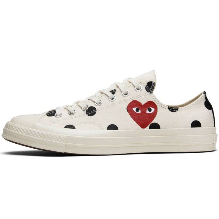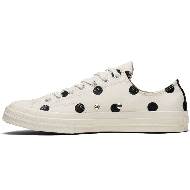 The Converse Chuck Taylor All Star 70s Ox Comme des Garcons PLAY Polka Dot White features a white canvas upper adorned with polka dots, capturing a classic yet trendy design.The Converse Chuck Taylor features a canvas upper with polka dot print in collaboration with Comme des Garcons. The color is predominantly white with black polka dots. The style is a low-top, classic Chuck Taylor silhouette. The shoes are crafted with durable materials to ensure longevity and comfort. The sneaker showcases the classic All Star logos on each medial ankle, paying homage to their heritage. Adding a touch of contrast, the heels feature a black canvas panel.At Newsole, the standout feature that genuinely captivates us about the Converse Chuck Taylor is the black canvas panel on the heels, strikingly contrasting the overall design. This artistic touch elevates the classic silhouette. The Converse Chuck Taylor All Star 70s Ox Comme des Garcons PLAY Polka Dot White was released on October 16th, 2017, and sold for $125.