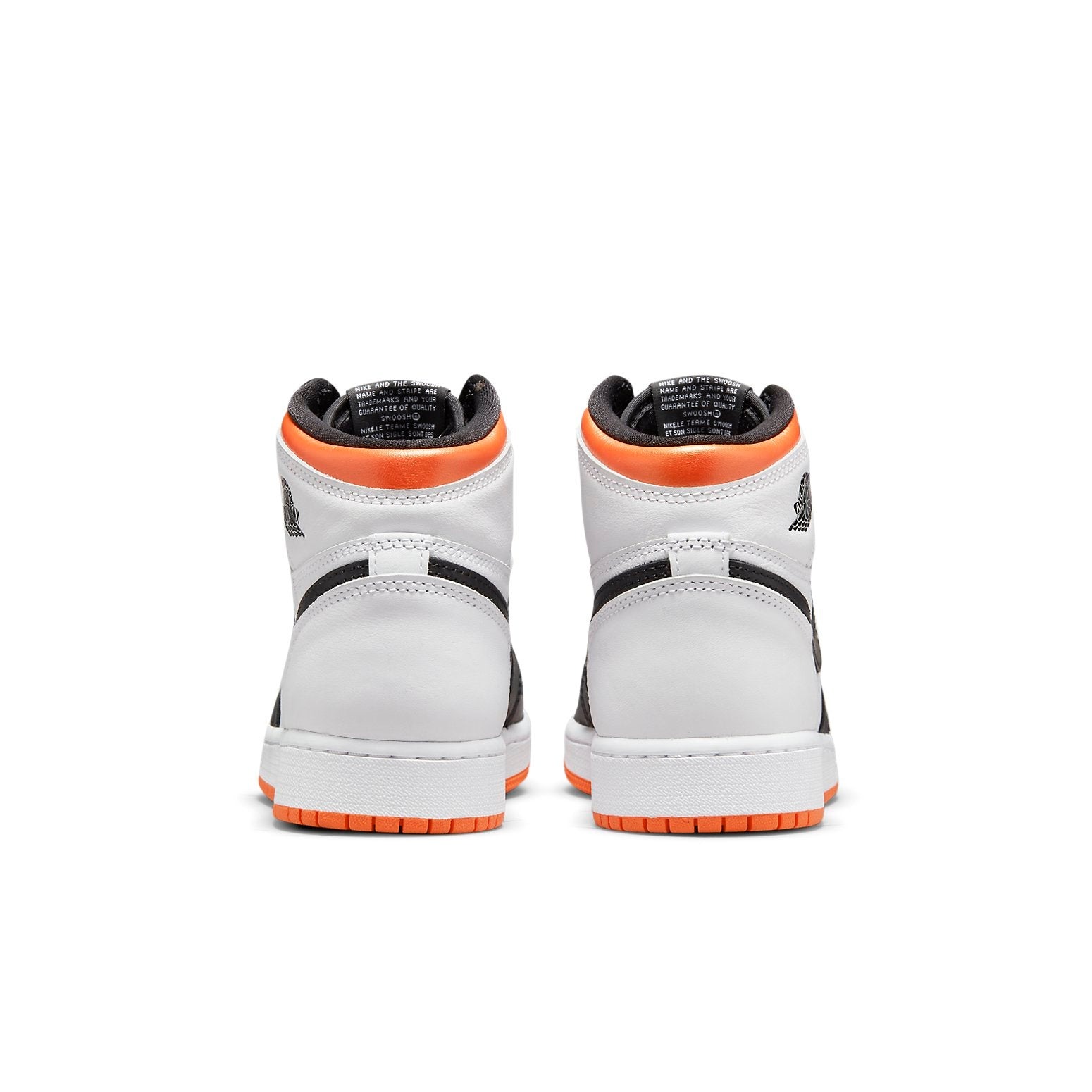 The Air Jordan 1 High OG Electro Orange GS is a grade-school shoe that is reminiscent of the 2015 Shattered Blackboard. Constructed with a white leather base, this shoe s upper features black overlays on its forefoot, eyelet, and around the toe box. It also features a black nylon tongue and an electro orange padded collar. Underfoot, it boasts air on its midsole to provide cushioning, and a hardened orange rubber sole that provides grip.The Air Jordan 1 High OG Electro Orange GS was released on July 17, 2021. Its original retail price was $130.