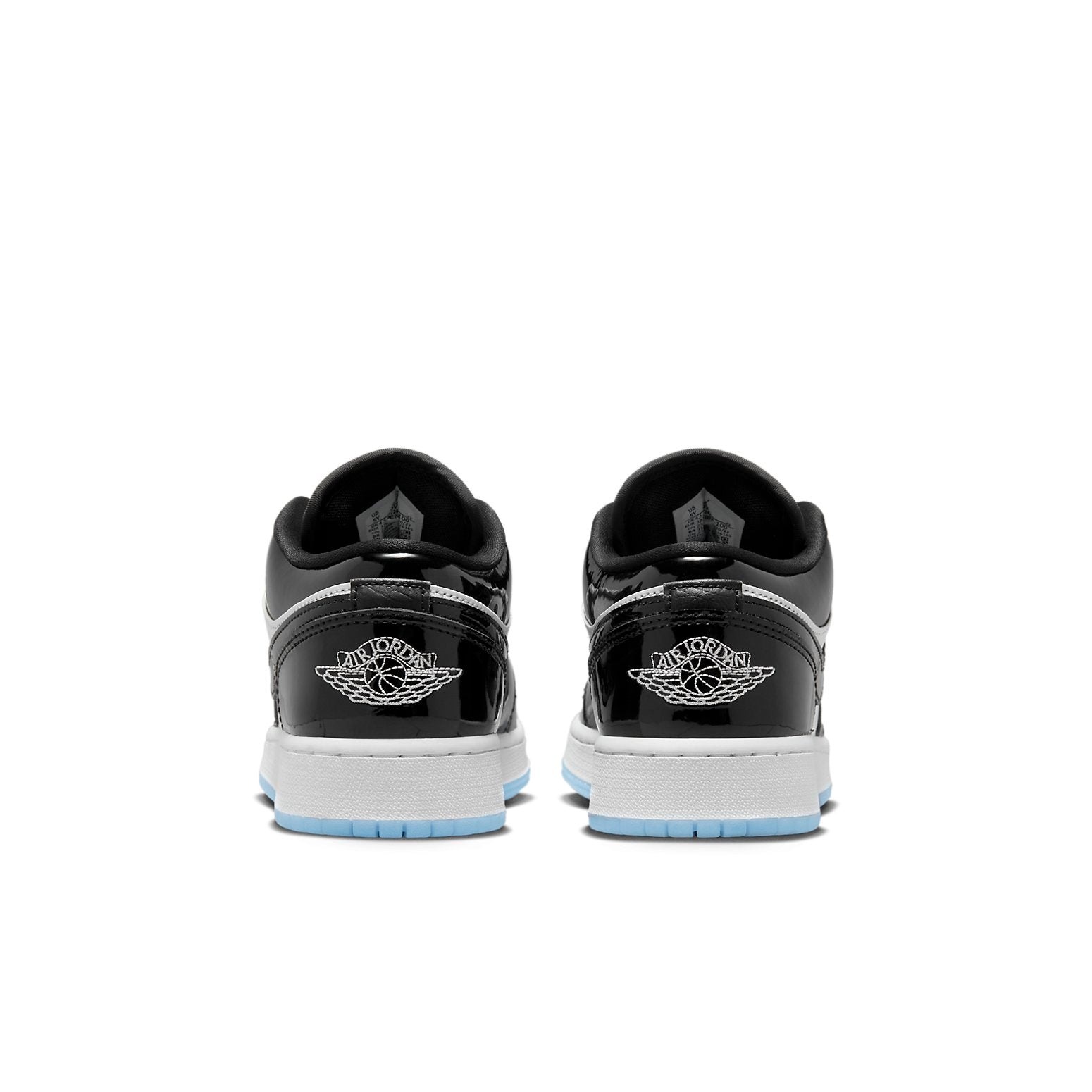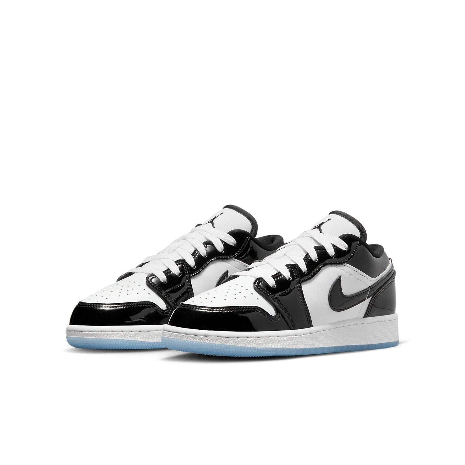 The Air Jordan 1 Low SE Concord (GS) comes in a white and black color palette.The Jordan 1 Low SE Concord has a leather upper, and the Jumpman emblem is embroidered on the tongue. The sneaker features a lightweight midsole for padding and a sturdy rubber outsole for grip and stability. The shoe also features a padded collar and perforations in the toe box for ankle support and ventilation, respectively. The sneaker’s design is completed with a Nike Swoosh on the lateral sides and an Air Jordan logo on the heel.The grade schoolers sizing of the Air Jordan 1 Low SE Concord (GS) was released at a retail price of $95 on January 17, 2023.
