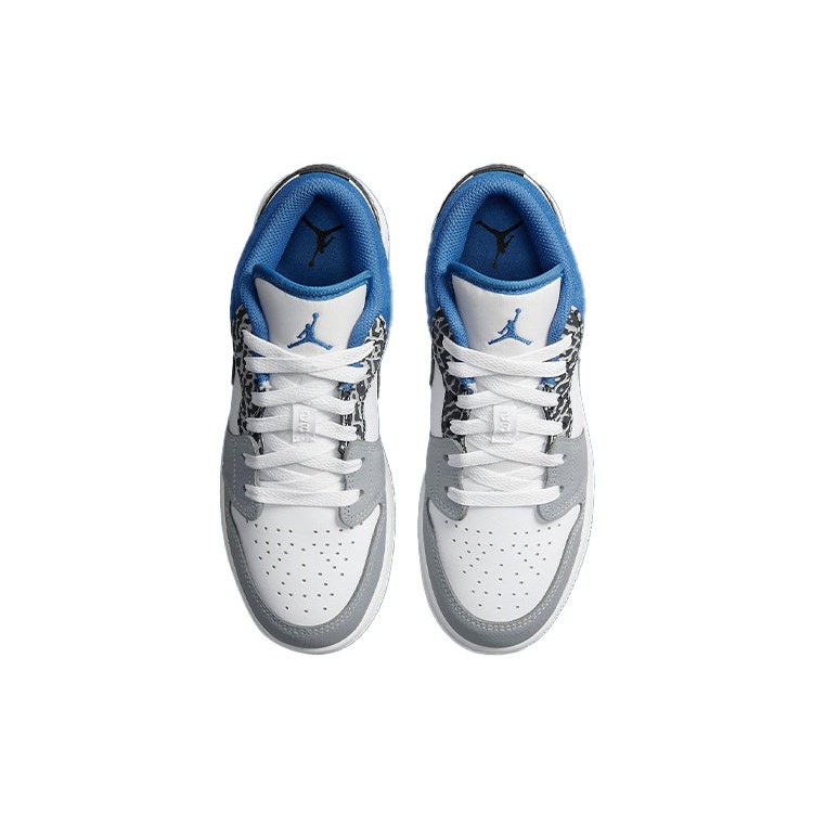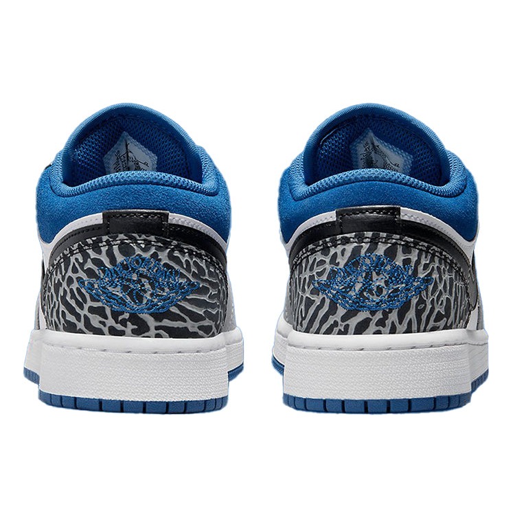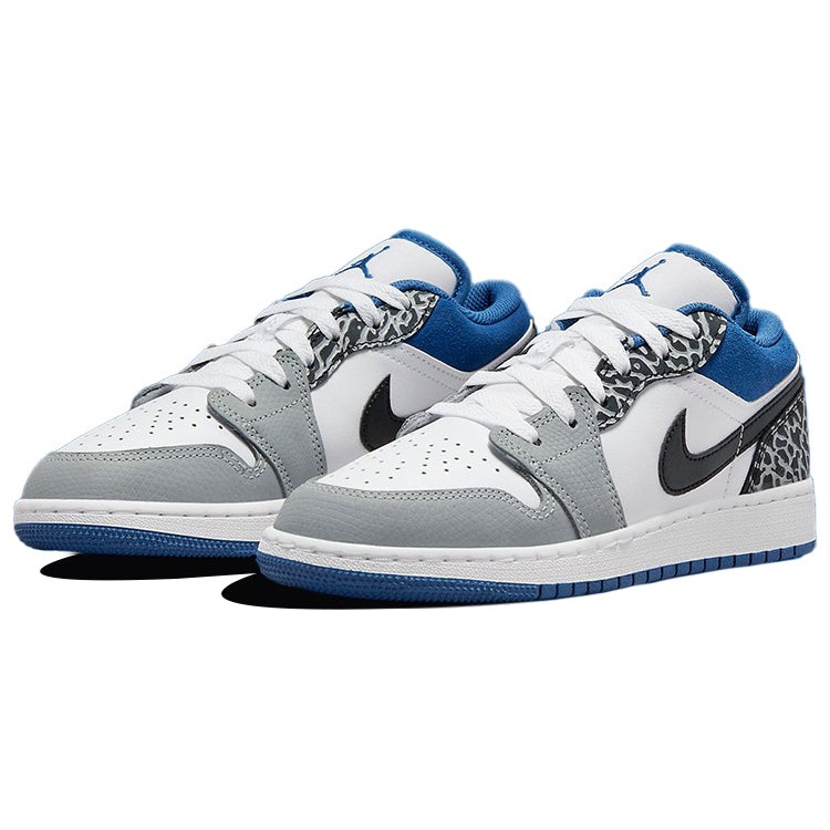This Air Jordan 1 Low SE True Blue pays tribute to the original Air Jordan 3 „True Blue“ and introduces elephant print to the silhouette.The Air Jordan 1 Low SE True Blue upper is built on a white leather base with grey textured leather wrapping around the toe. The sneaker introduces an elephant print on the heel and eye stays, and blue suede adorns the collar. Black is introduced on the Swooshes, and the blue trim continues to the liner, Wings motif, and rubber outsole.The Air Jordan 1 Low SE True Blue was released in June 2022 and retailed for $110.