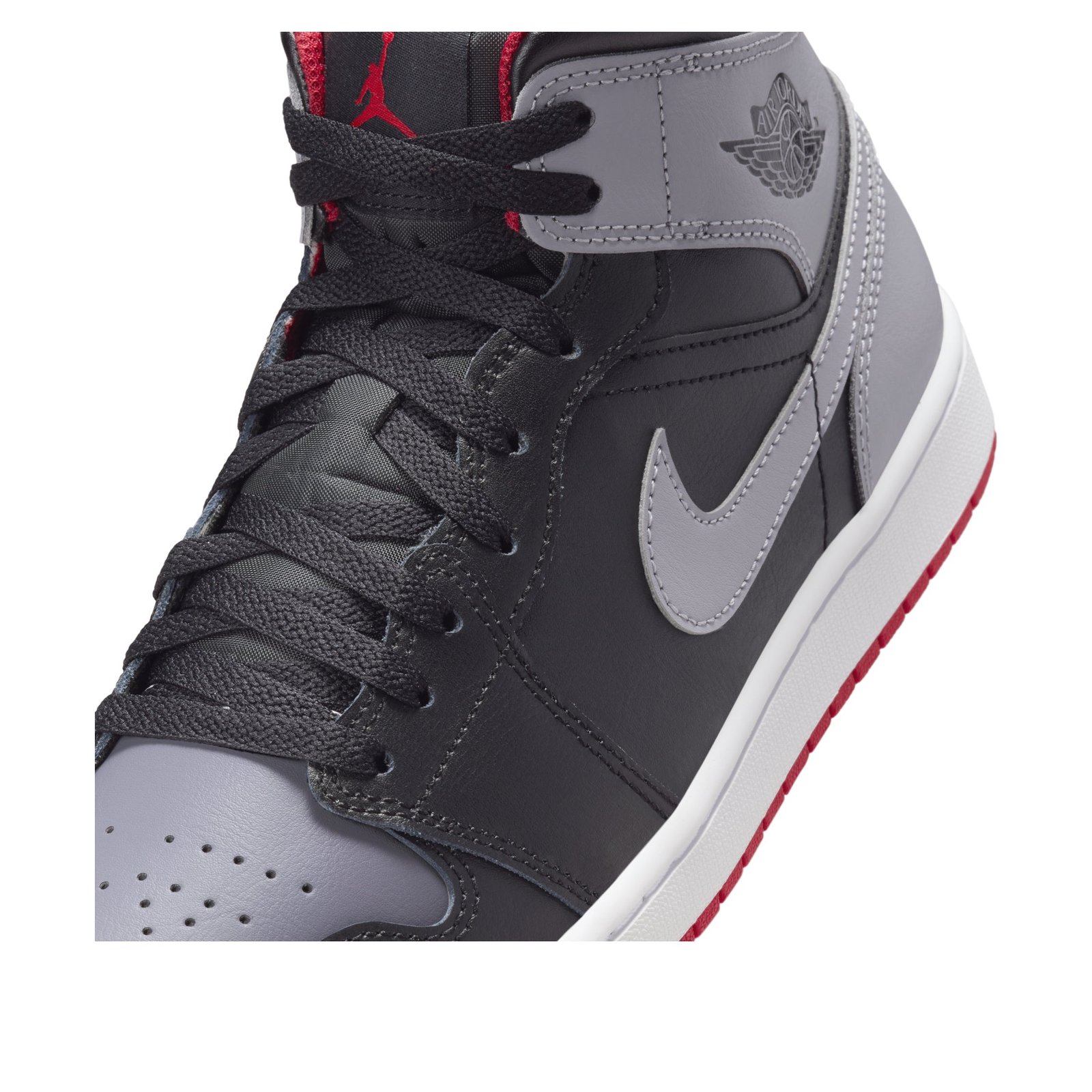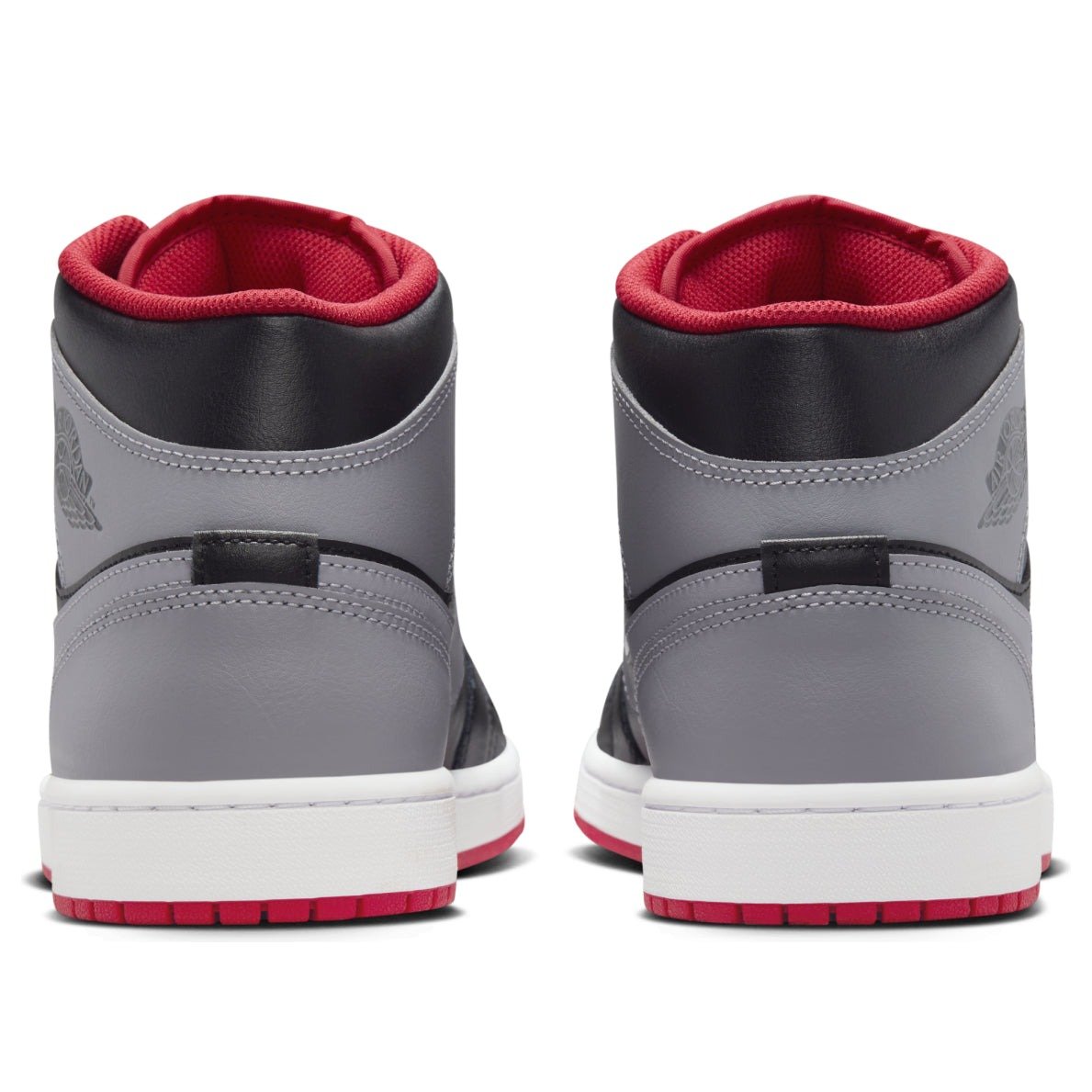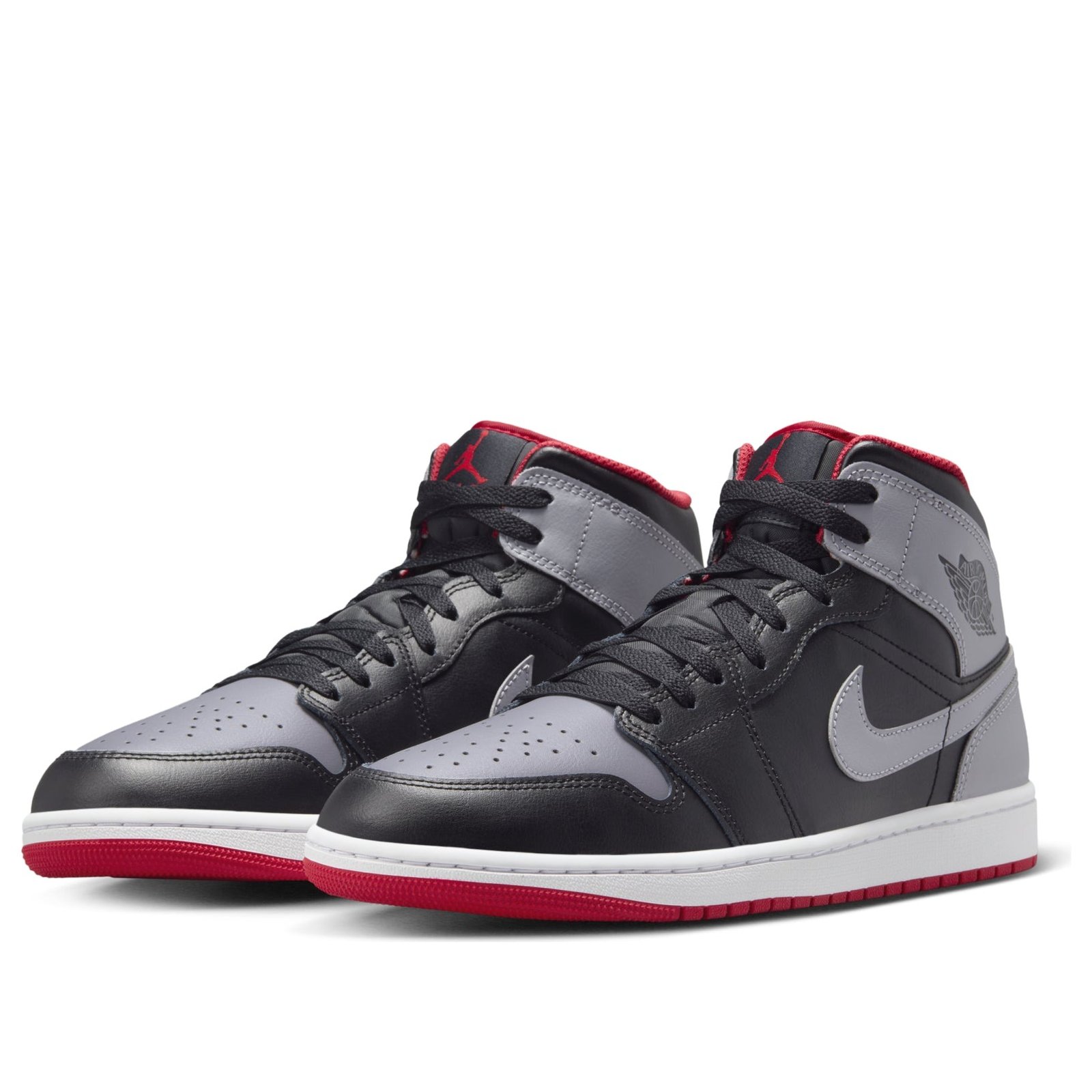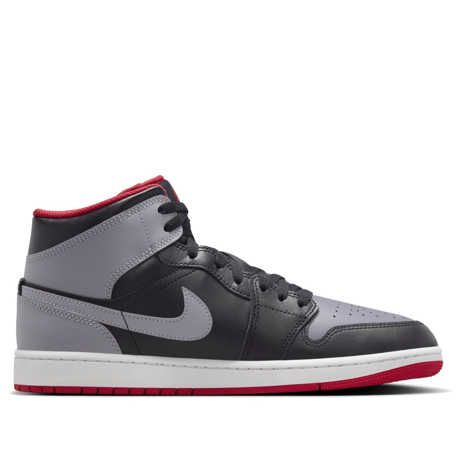 The Jordan 1 Mid Bred Shadow is a mid-top shoe with a look inspired by the OG Shadow colorway. This version of the Jordan 1 Mid is made with a full leather upper. The base is black, which adorns most of the shoe except for the perforated toebox, the ankle strap, and the heel, which all appear in a darker gray color. The Nike Swoosh also shows up in gray across both midsoles, and the Air Jordan logo appears stamped in black on the lateral side of the ankle strap. A red Jumpman logo appears on the black tongue, and the sock liner is the same bold red color. A rubber white and red outsole completes the look. What we like most about the shoe are the pops of red on the outsole, the tongue, and the sock liner. These add bold contrast to the otherwise black and gray design. The Jordan 1 Mid Bred Shadow was released on January 23, 2024, for a retail price of $125.