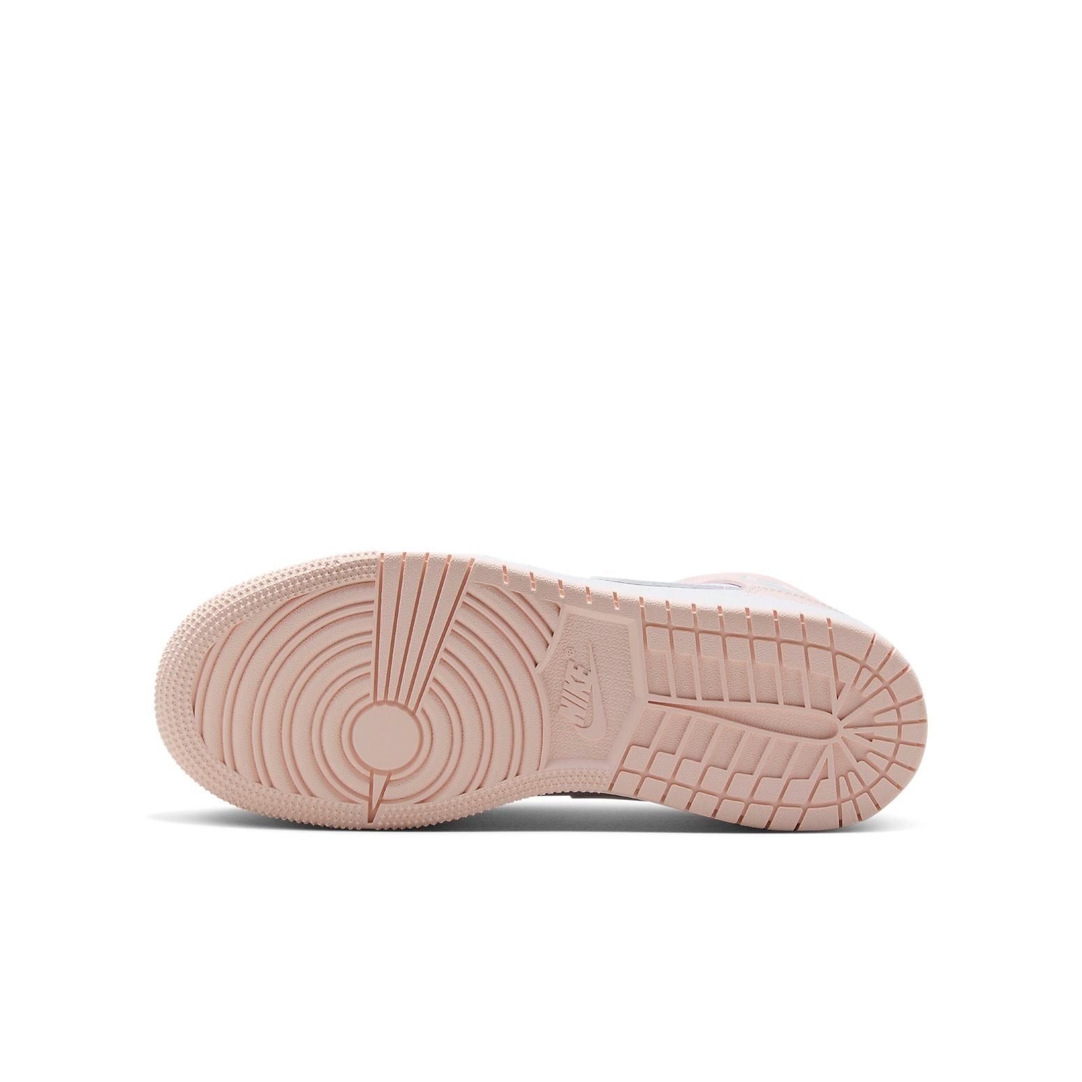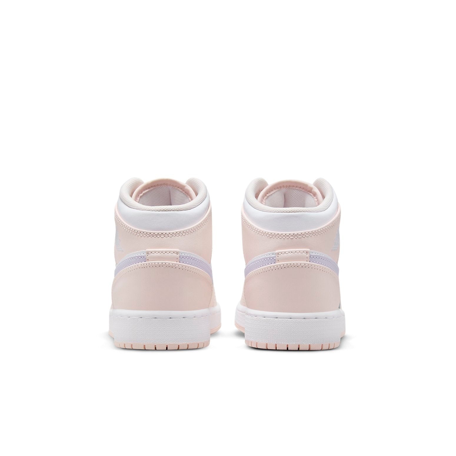 The Jordan 1 Mid Pink Wash (GS) dresses this iconic 80s basketball design in light pastel colors, then sizes it for grade school-aged kids.The upper of this charming kids sneaker is crafted of leather with a smooth white base. The iconic perforations dot the toebox to facilitate breathability and enhance comfort. Pale Pink leather is used for the overlays that adorn the collar, heel, eyestays, midfoot, and toecap to provide the shoe with iconic color blocking for a timeless style. The collar is padded for ankle comfort and flat laces crossover a white nylon tongue for a snug closure. The midsole of white foam cushions and supports as it encapsulates Air. Finally, a Pale Pink rubber outsole locks in the look of this shoe.The standout feature of this kids sneaker that we appreciate the most is the lavender side panel Nike Swoosh. This hit of light purple provides a harmonious note of contrast. The Jordan 1 Mid Pink Wash (GS) was released on December 12, 2023, for $110 retail.