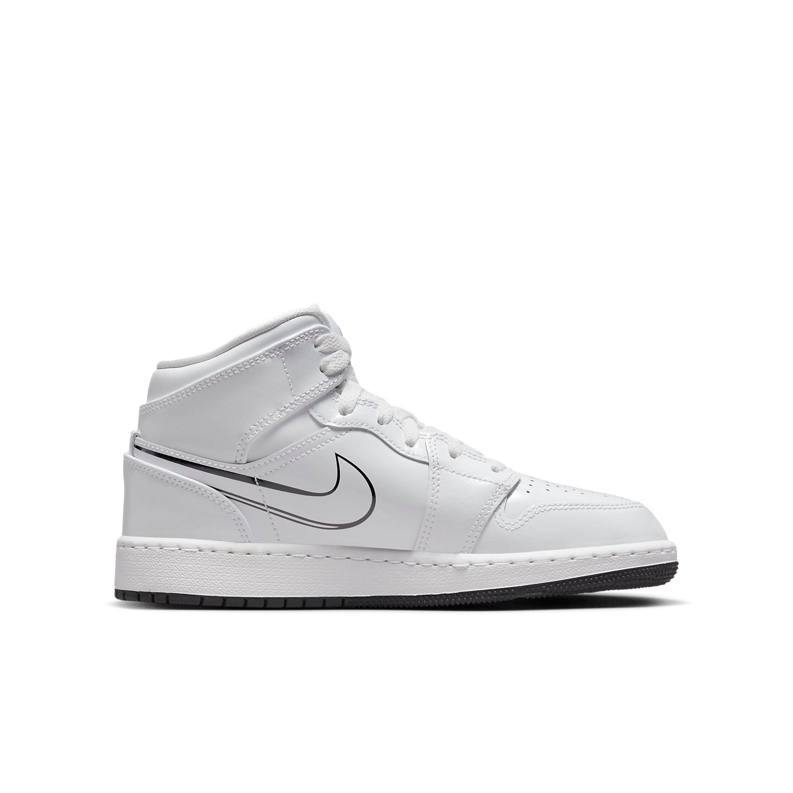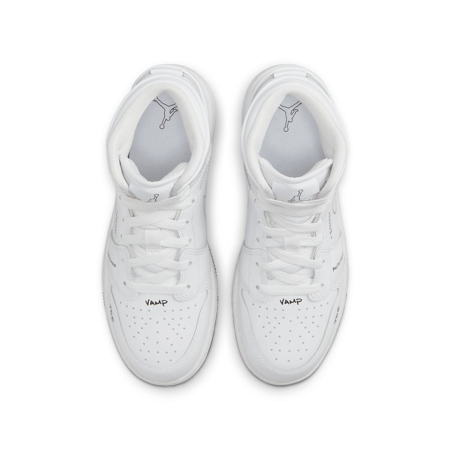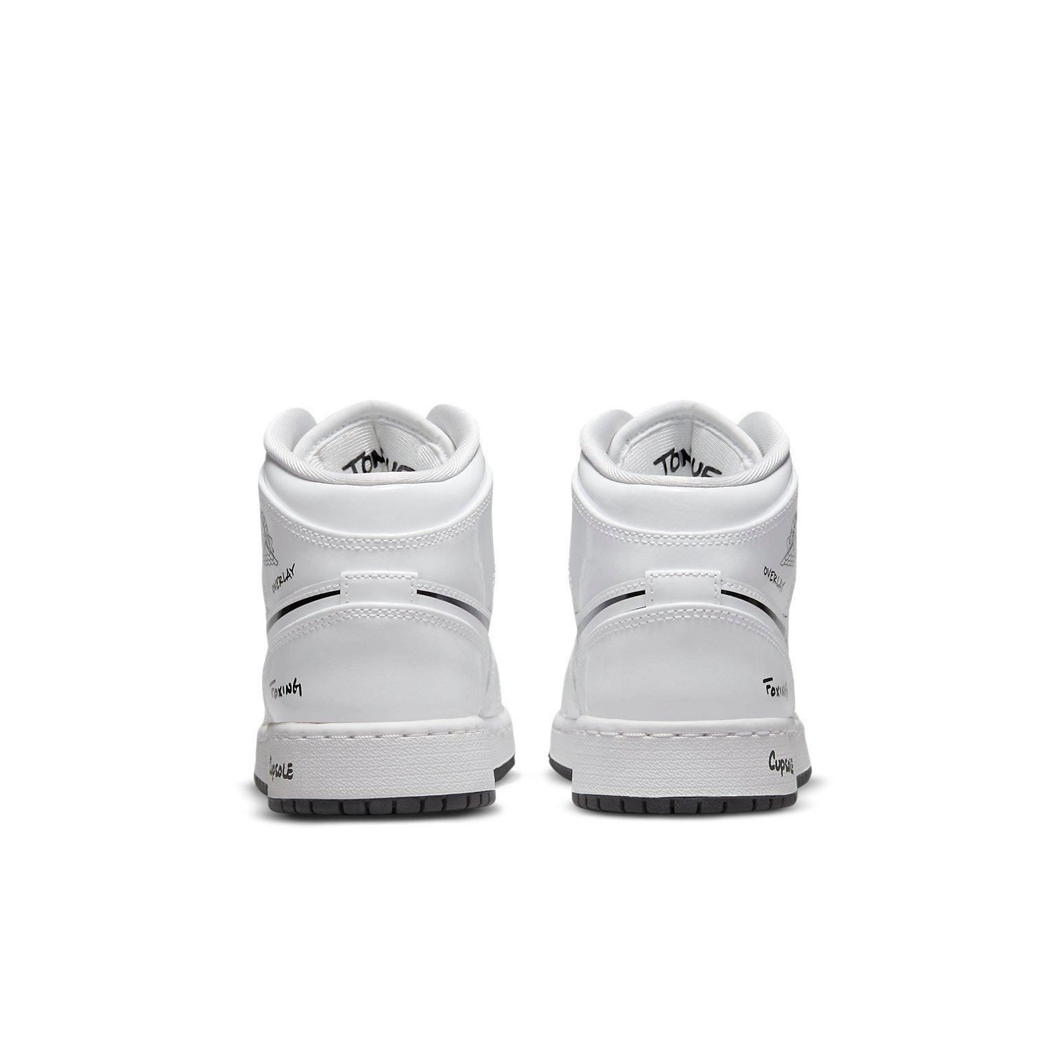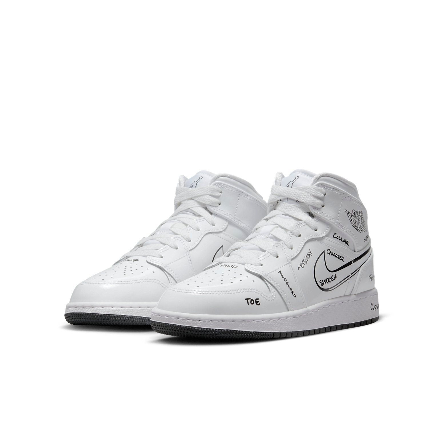 The Jordan 1 Mid Schematic (GS) is designed for grade school kids. Jordan 1 Mid Schematic (GS) for grade schoolers has a color scheme of white and black. The footwear features a white leather upper with black writing that reads „collar,“ swoosh