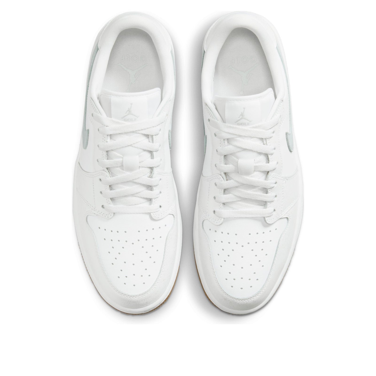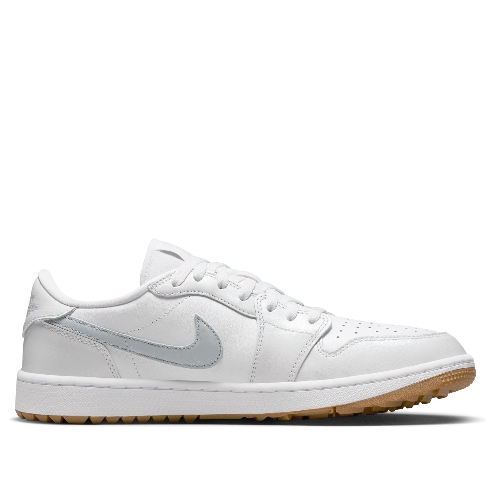 The Jordan 1 Retro Low Golf White Gum is a low-top golf shoe equipped with Air cushioning and a special traction pattern for the course. The white gum version of the Jordan 1 Retro Low Golf has an upper made of genuine leather. This material forms the perforated toe box and the side panels. Overlays in pure platinum, which have a subtle silver sheen, form the toe cap, eyestays, and heel counter. The Nike Swoosh adorns both sides in silver. The Air Jordan logo appears on the back of the heel, while the tongue bears a Jumpman patch. The shoe rests on a white Air-cushioned midsole and a gum rubber outsole. Our favorite things about this sneaker are the pure platinum overlays, which add more visual interest to an otherwise white shoe. The Jordan 1 Retro Low Golf White Gum was released on January 20, 2024, for $150.