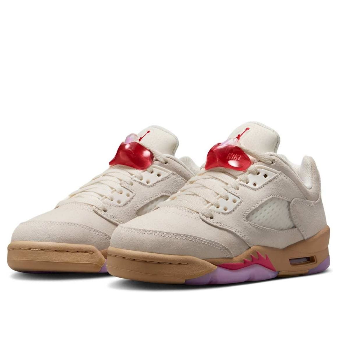 The Jordan 5 Retro Low Peanut Butter & Jelly (GS) features a Pale Ivory/Fusion Red/Desert/Rush Fuchsia colorway. This Jordan 5 Retro Low was first released for $140 on May 01, 2025.