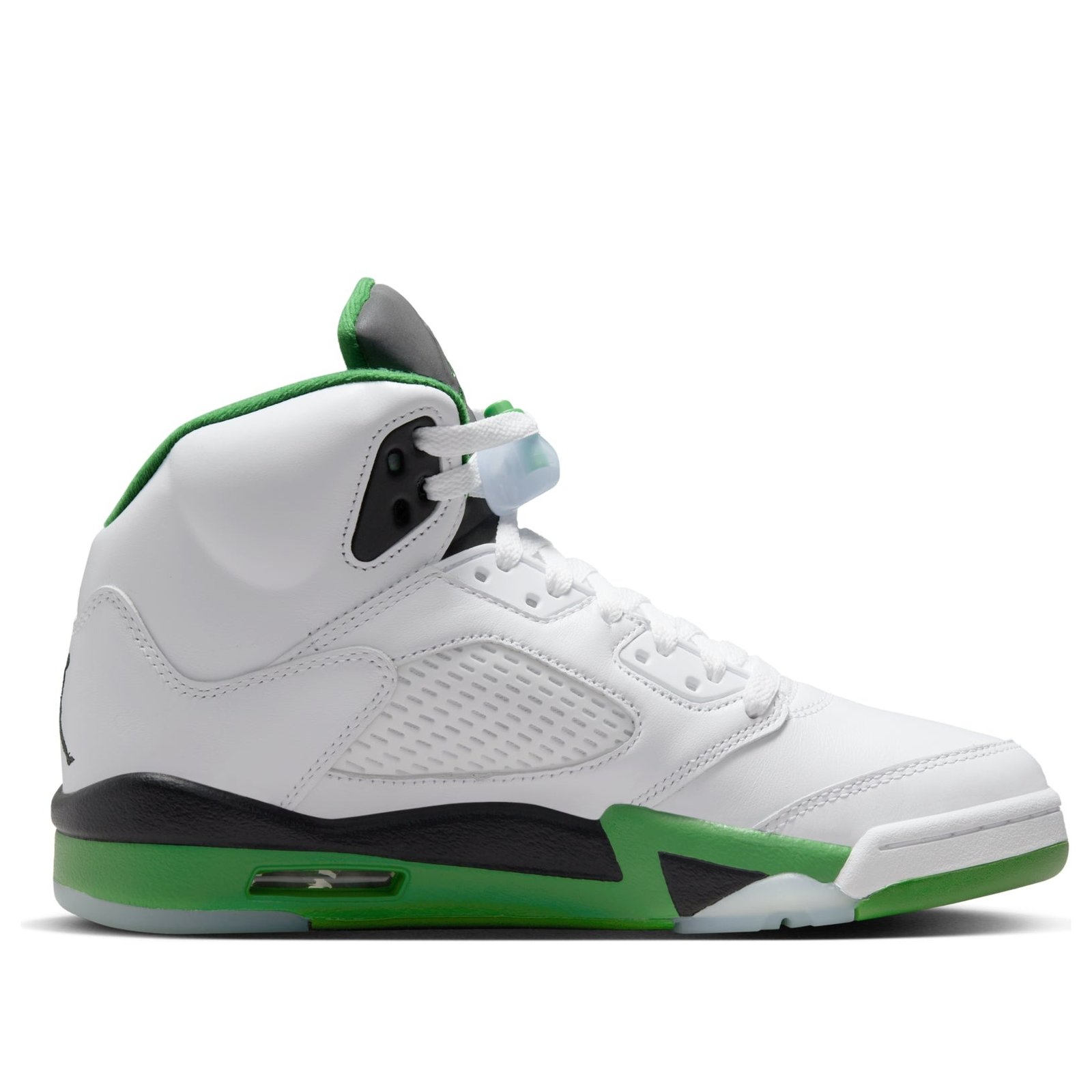 The Jordan 5 Retro Lucky Green (Women’s) applies bold Lucky Green accents and a Crisp White base to the recognizable Jordan 5 Retro silhouette.Released ahead of Saint Patrick s Day, this basketball AJ 5 boasts Lucky Green accents on the insole, the padded collar, the lace closure system s toggle, and the angular midsole. While the Jumpman logo on the heel comes in gray, the logo on the tongue is embroidered with Lucky Green thread. The upper is made of a combination of leather and synthetic materials, including mesh on the quarter panels and smooth leather overlays. Featuring a zig-zag pattern and Nike Air cushioning underfoot, the midsole sits on a durable rubber outsole.Our Newsole experts like the 23 embroidered on the heel, which pays homage to Michael Jordan s legacy. The women s size Jordan 5 Retro Lucky Green (Women’s) was released on February 28th, 2024, and retailed at $200.