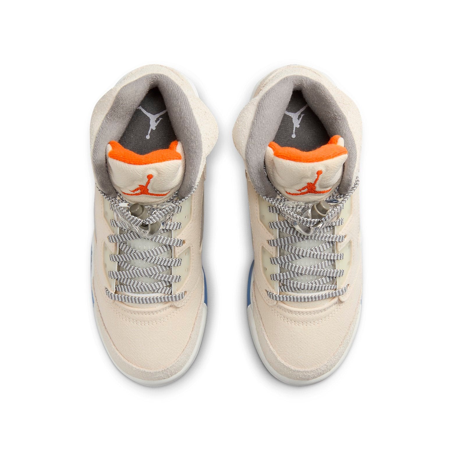 The Jordan 5 Retro SE Craft Light Orewood Brown (GS) adopts a retro silhouette based on the original 1990 design. It uses a desert-themed colorway spiced by a splash of vibrant safety orange.The Jordan 5 Retro SE Craft has an ice blue outsole and a white-speckled midsole with a transparent Air Max unit appearing on the heel. A light orewood brown hue graces the suede mudguard. However, the vamp introduces a canvas material in a lighter sail color. The quarter panels feature a wide meshed plastic underlay, which extends to the eye stay, reinforcing the lacing system. The heel area of these grade school shoes has a full suede finish adorned by a grey embroidered Jumpman.Newsole experts love the creative infusion of safety orange accents on a seemingly monochrome colorway. The Jumpman tongue logo stands out owing to this conspicuous hue as does the tongue lining. Released on May 17th, 2023, the Jordan 5 Retro SE Craft Light Orewood Brown (GS) retailed at $150.