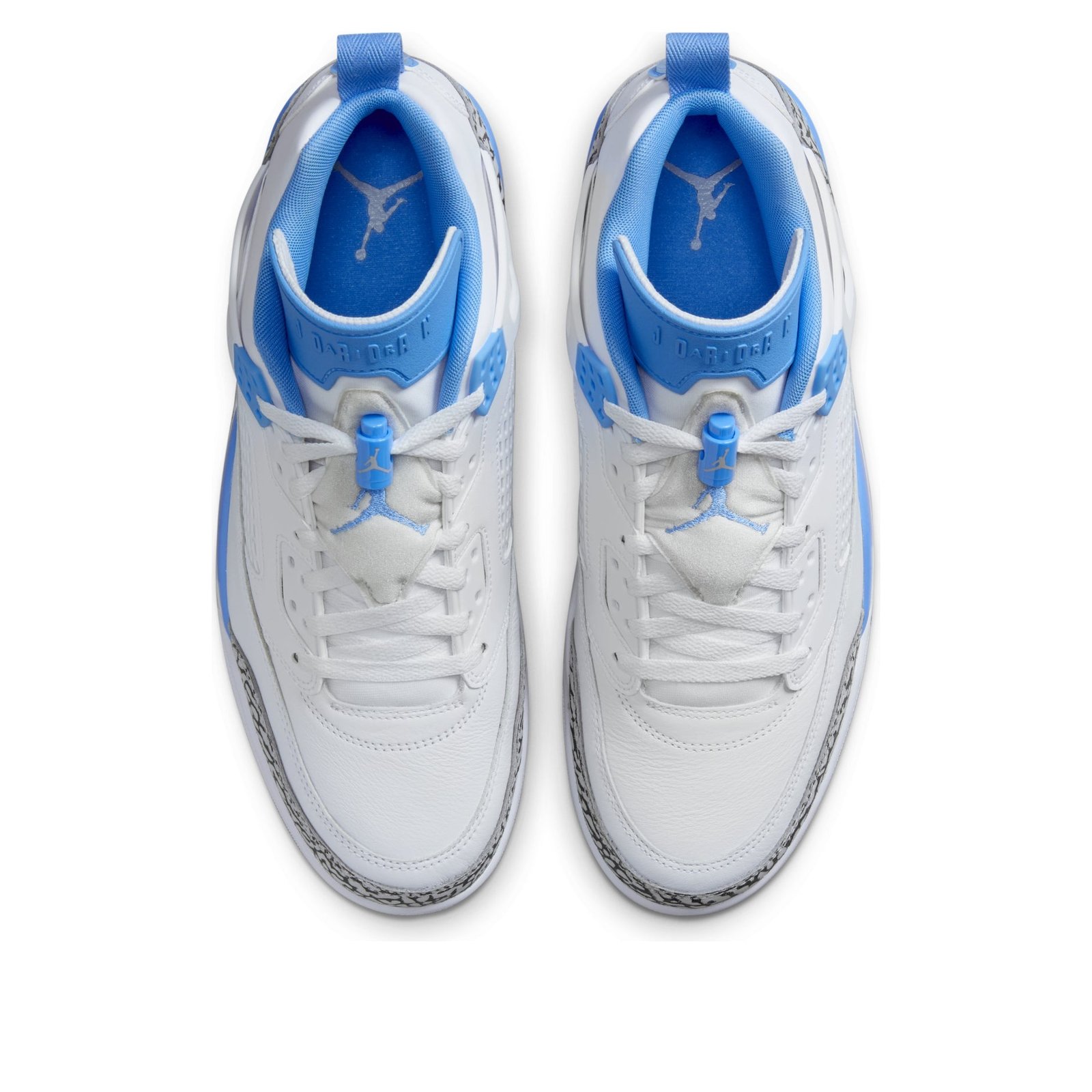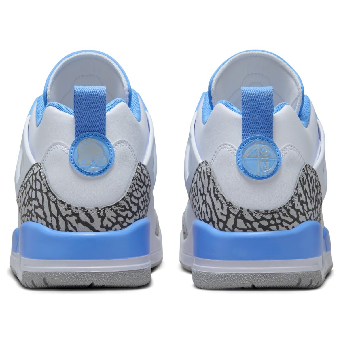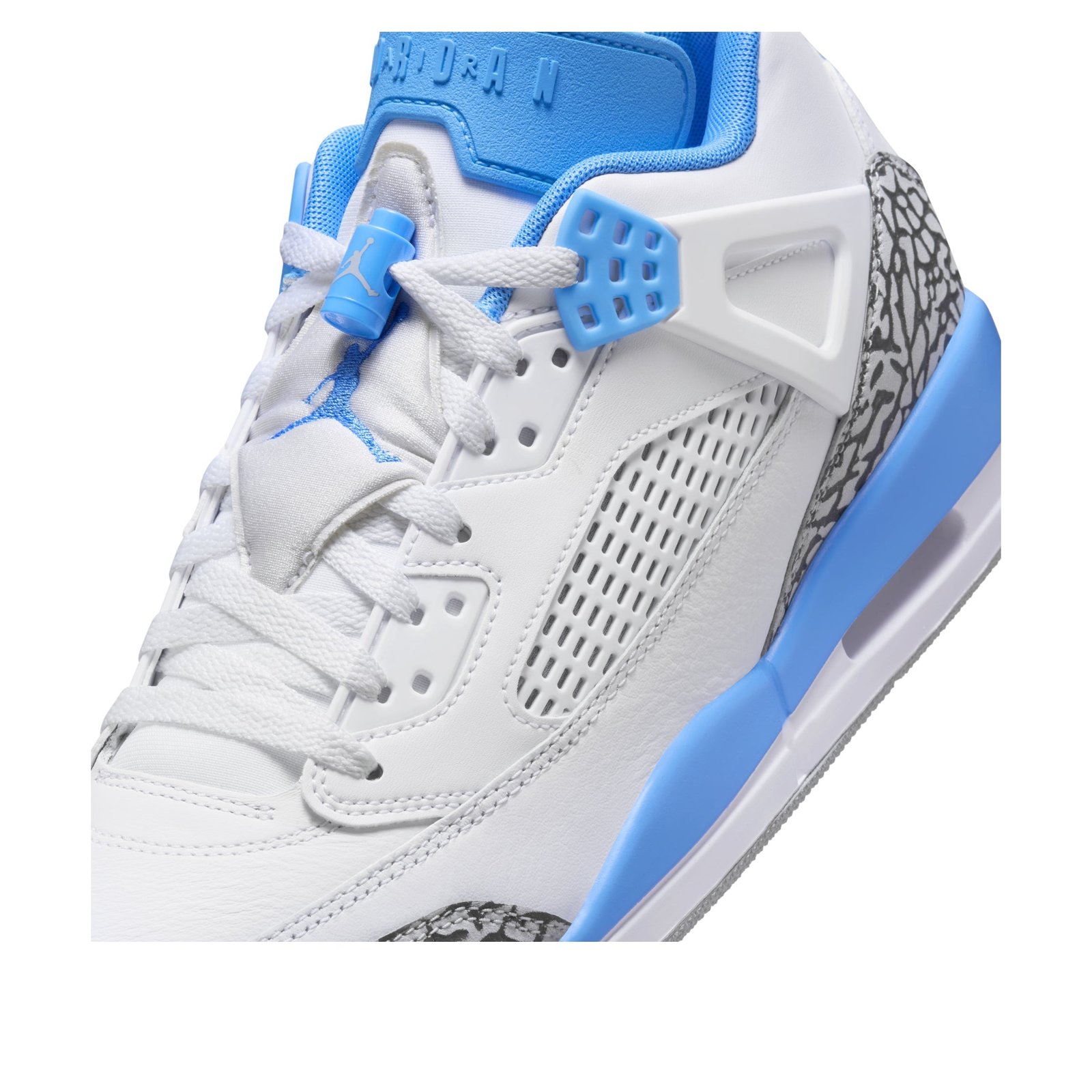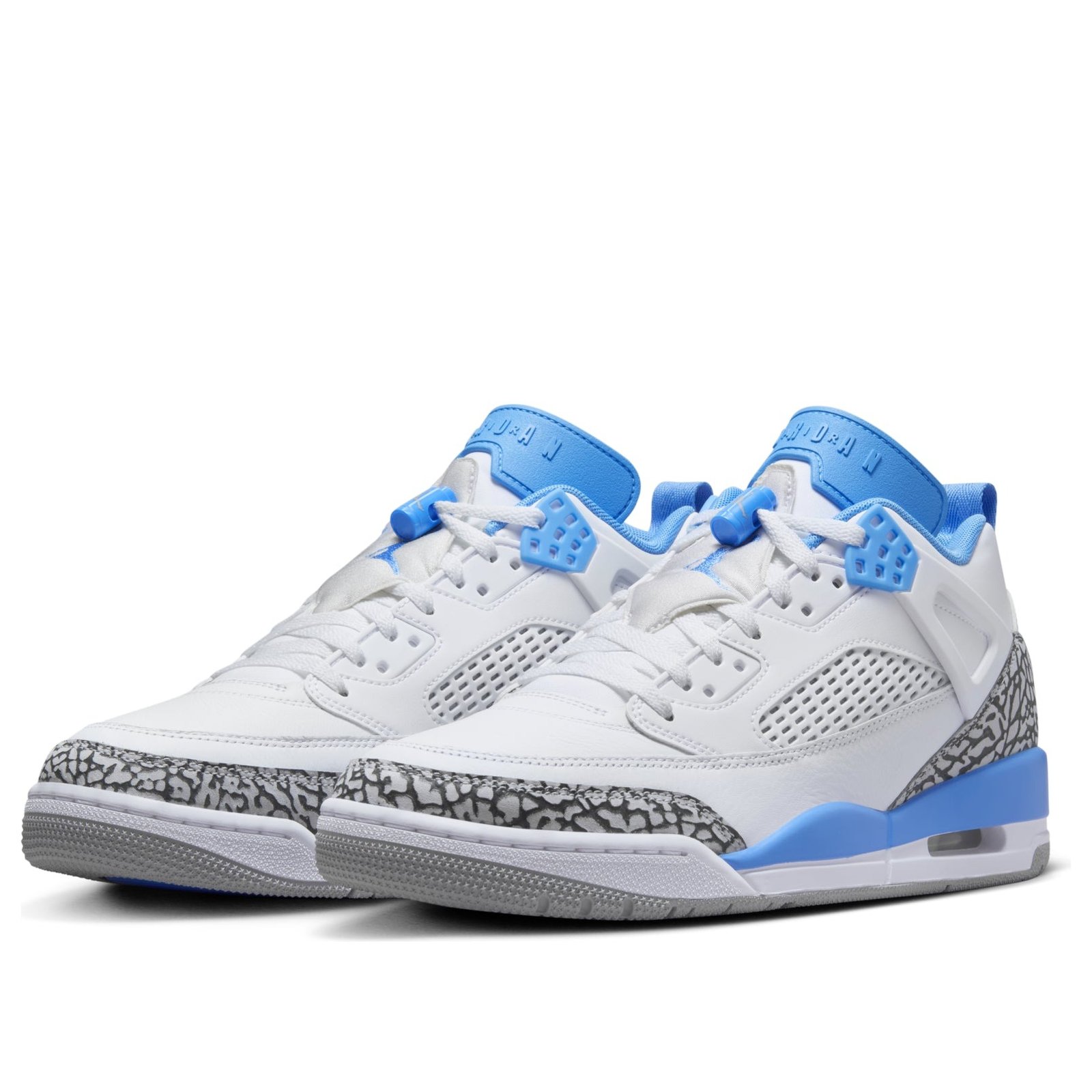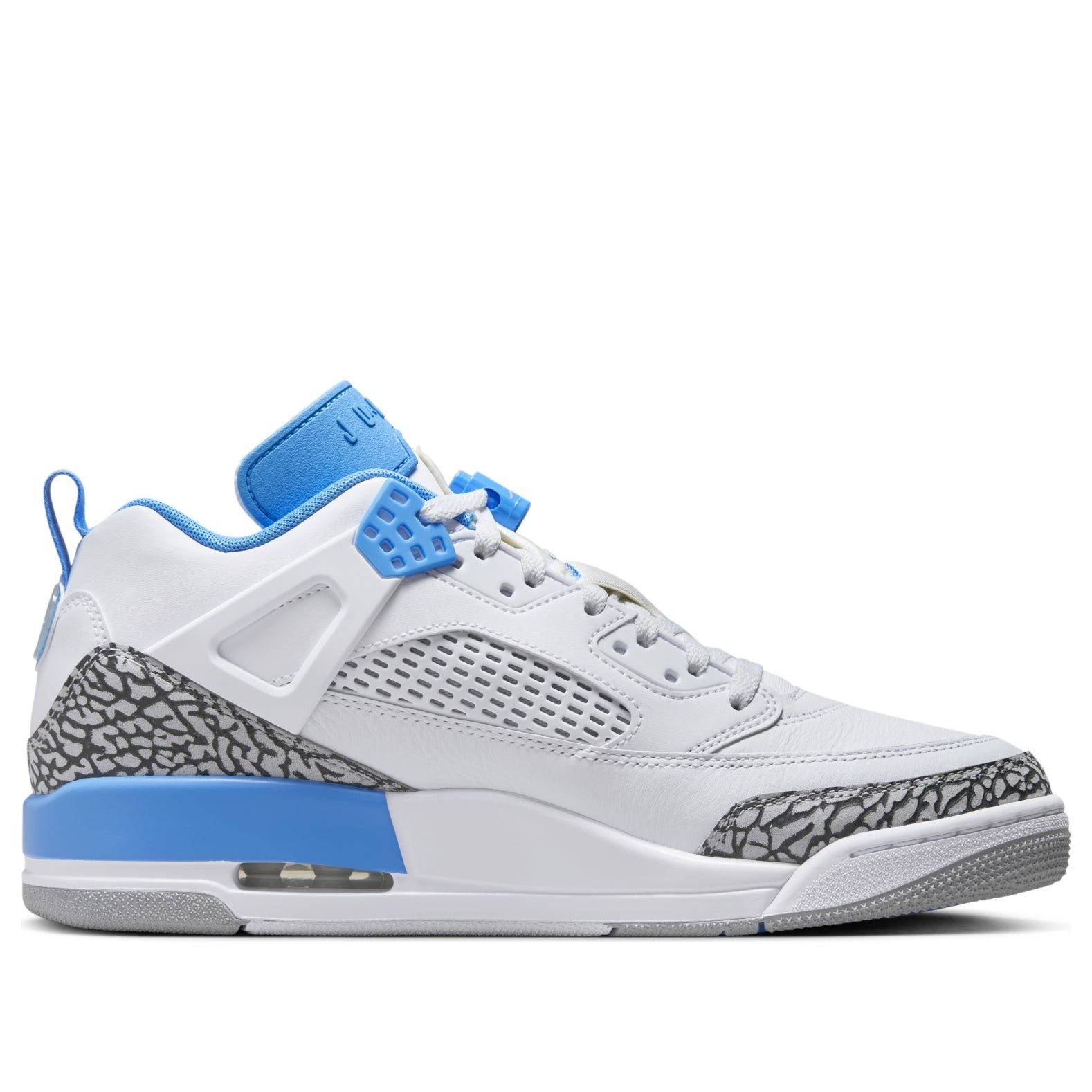 The Jordan Spizike Low UNC is a low-top sneaker that pulls design inspiration from the OG Spizike that was designed in collaboration with film director Spike Lee. This Jordan Spizike debuts in a low variant, while sporting design elements from other classic Jordan silhouettes over the years. Presenting in a white, university blue, wolf grey, and anthracite color palette, some will be quick to notice that these are the colors of Michael Jordans alma mater, the University of North Carolina. As for cushioning, youll spot the visible Max Air unit in the heel and feel the Nike Air unit in the forefoot. Elephant print dons the toe cap and heel cap, while Jordan branding is on the tongue and Spike Lees production companys logo on the heel tab. We love that the Jordan brand continues to honor Michael Jordans legacy and history through colorways that honor his beginnings, and this Jordan Spizike Low UNC does exactly that. This sneaker retailed for $160 during its retail debut on November 13, 2024.