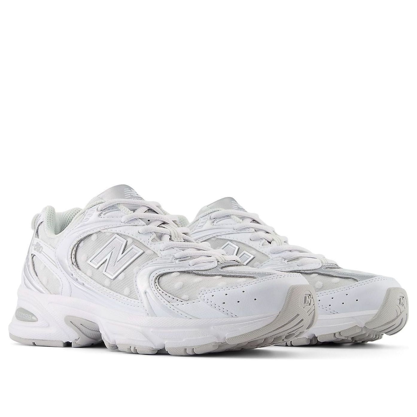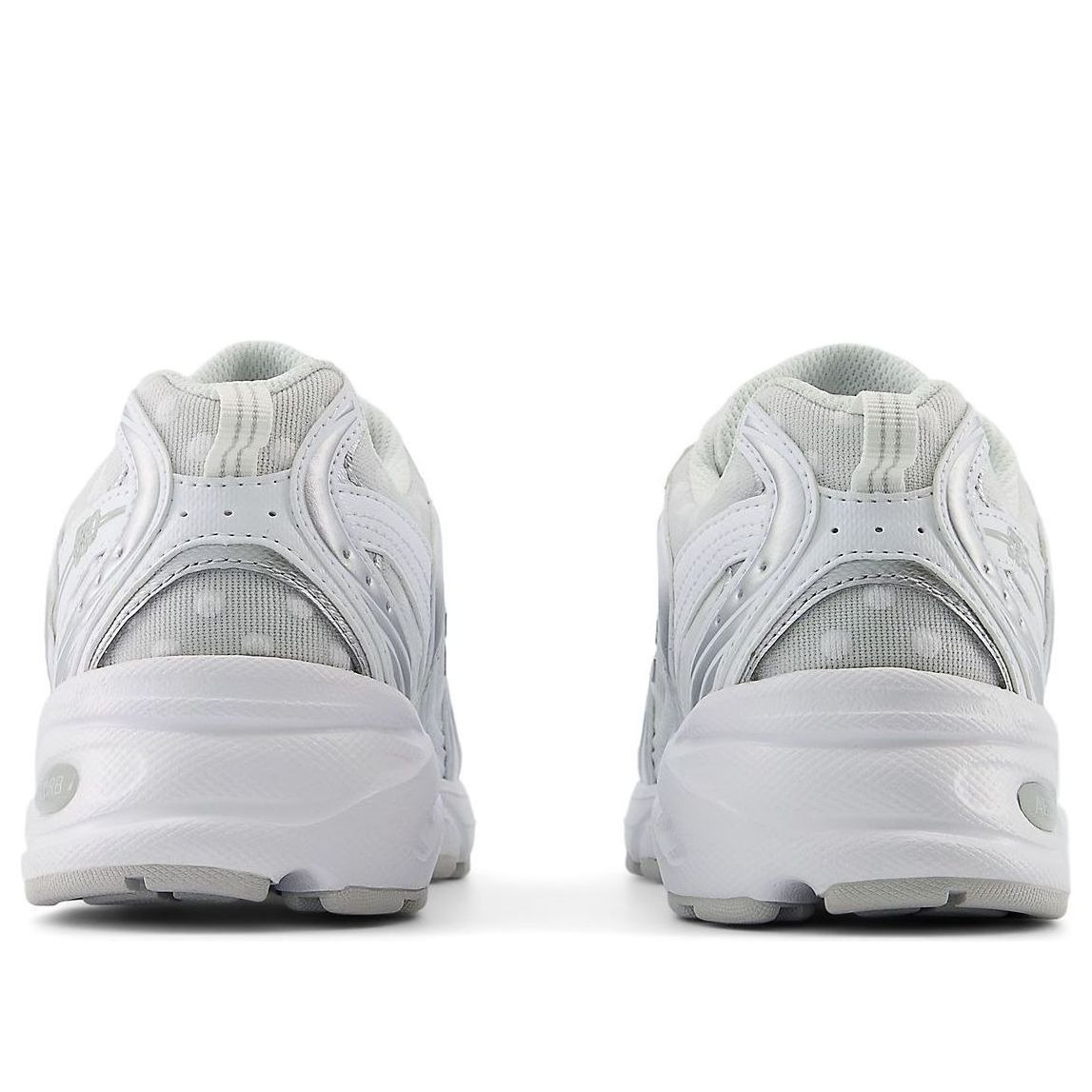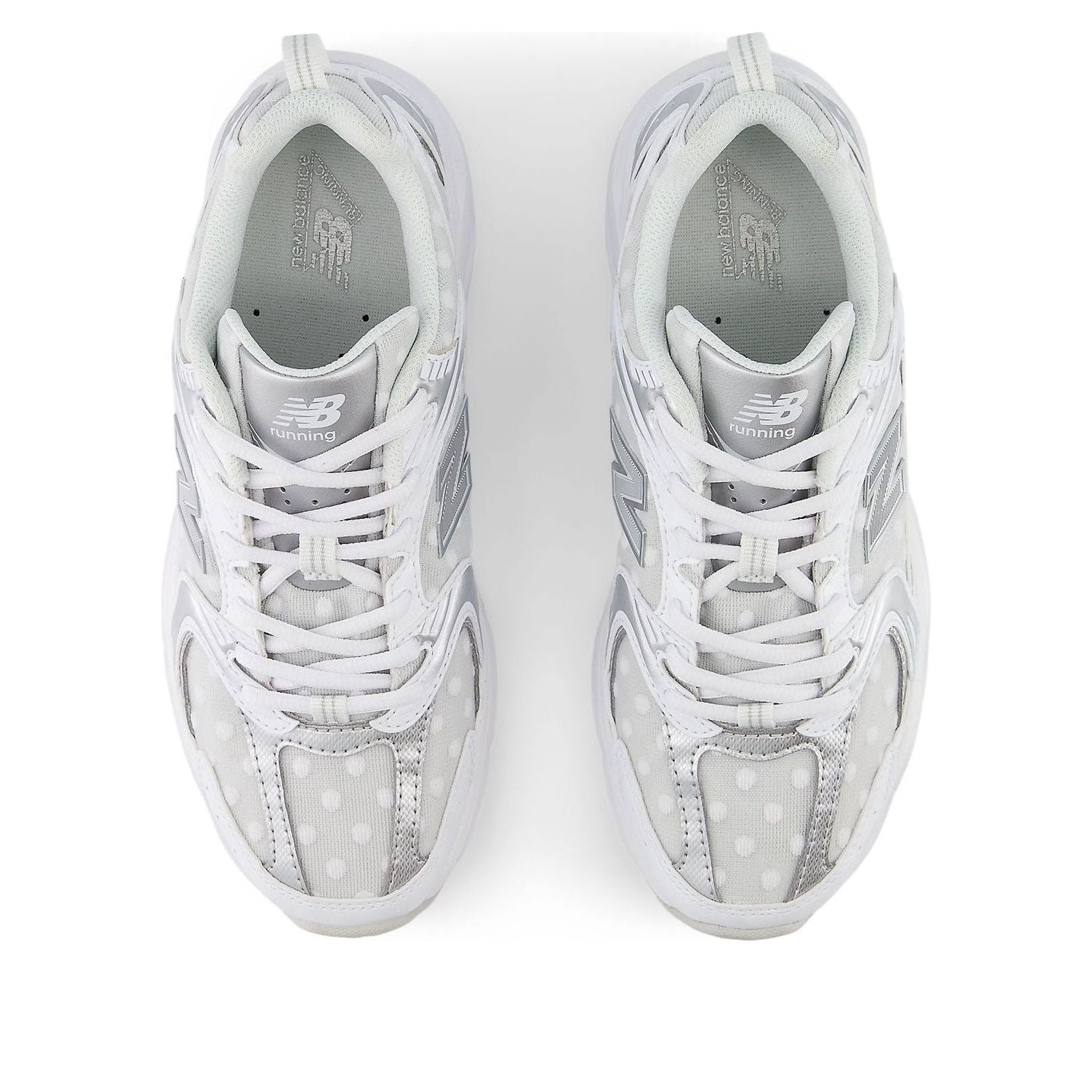 The New Balance 530 Silver Metallic Polka Dots is a running shoe whose design was inspired by the original model that debuted in the 1990s. This version of the New Balance 530 has an upper made of breathable mesh for its base. This base appears in a light silver color with white polka dots throughout. Supportive polyurethane overlays cross the upper in silver and white, while a Metallic Silver N appears on each side panel. 530 branding can also be seen on the lateral heel, while NB running branding appears on the tongue. The midsole is made of ABZORB cushioning for comfort and responsiveness, while the sole is patterned for traction. What we think stands out about this shoe are the polka dots, which add a playful touch to the overall design. The New Balance 530 Silver Metallic Polka Dots was released on November 27, 2024, for a price of $100.