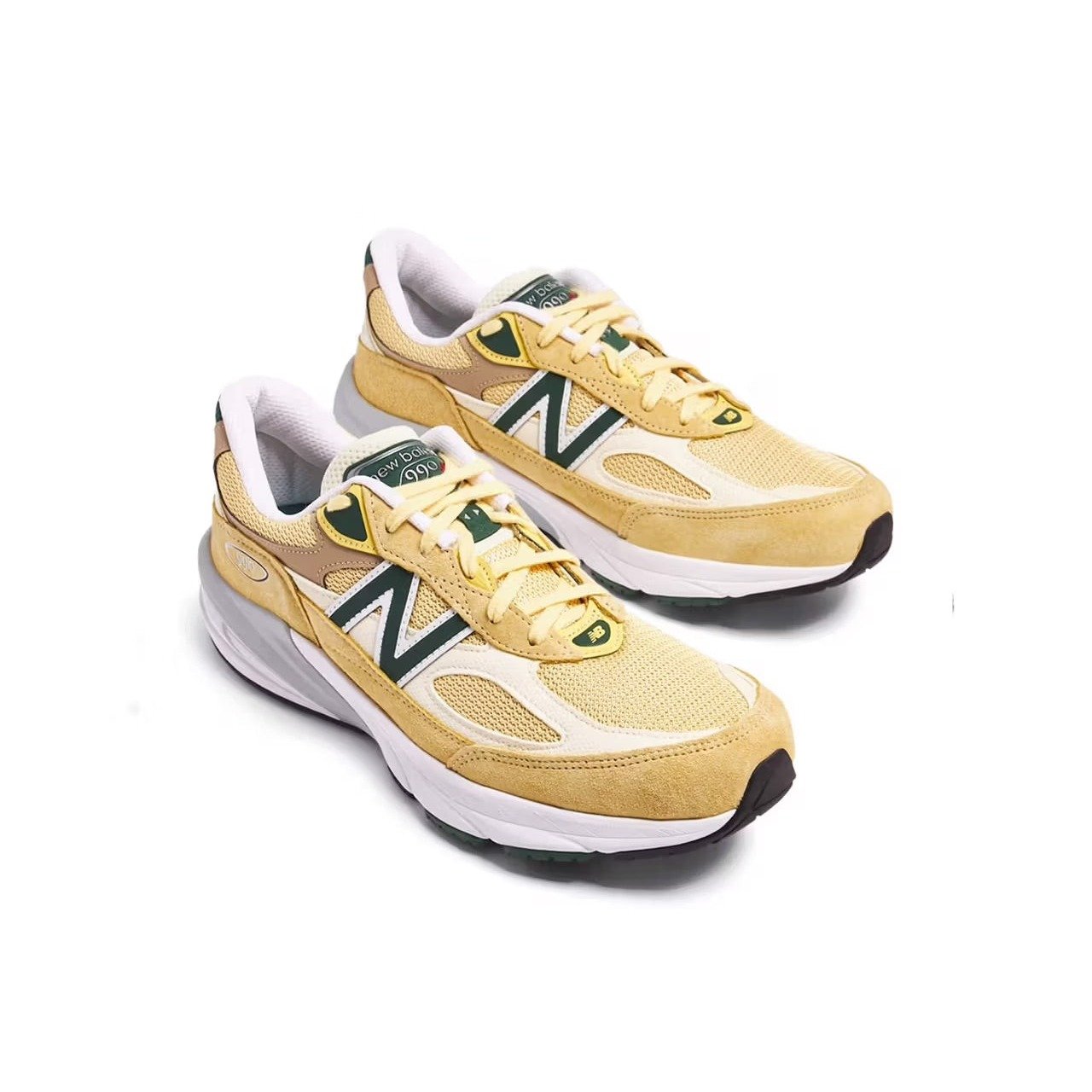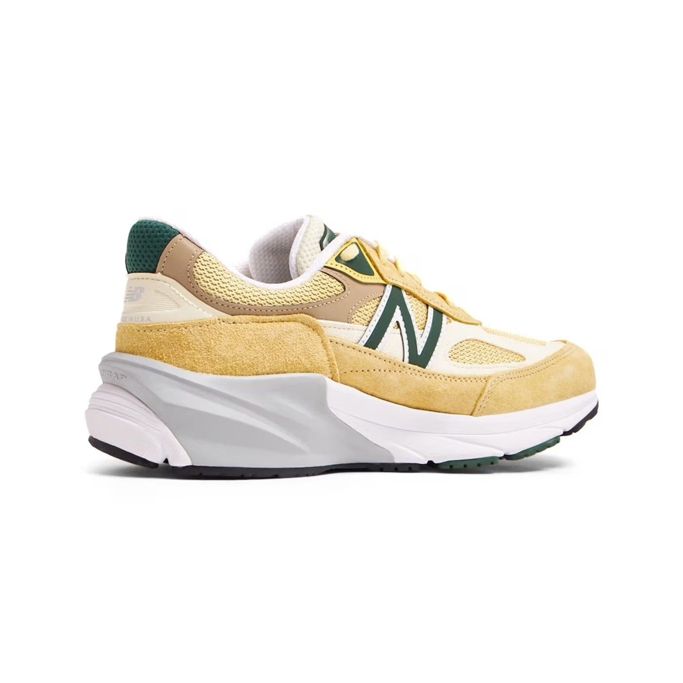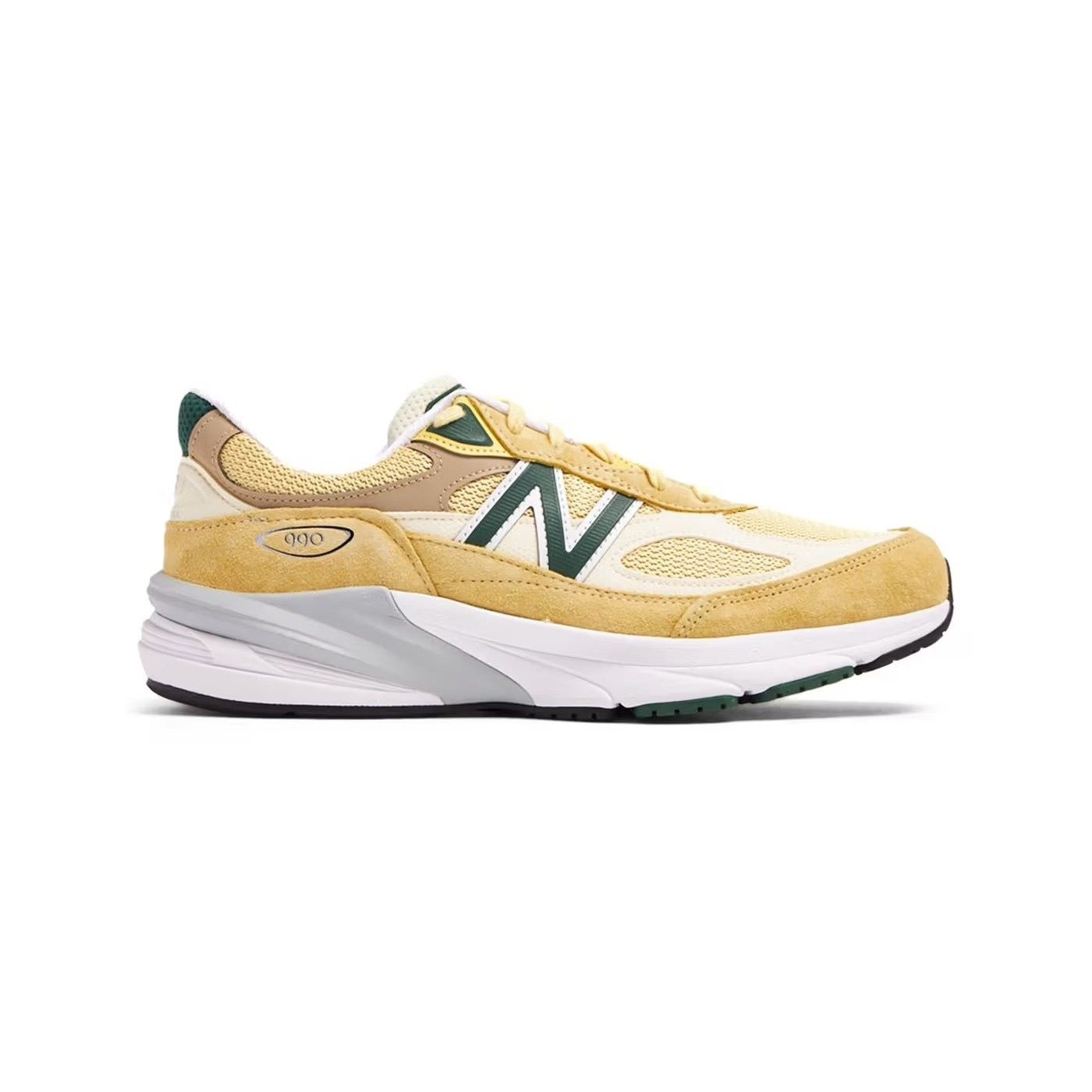 The New Balance 990v6 MiUSA Sulphur Green benefits from design input from Teddy Santis, often a collaborator in the Made in the USA (MiUSA) New Balance line. This colorway featuring gold, green, and soft brown provides a perfect transition from summer to fall footwear. The upper of the comfortable lifestyle MiUSA Pale Yellow New Balance 990v6 sneaker begins with a base of golden mesh overlaid with cream-colored and cocoa-brown leather, along with darker golden suede at the mud guard and eyestays. Butter-yellow laces offer a soft touch and a snug closure. The white-and-gray ENCAP midsole offers elite cushioning and rides on a rubber outsole patterned for traction. What we enjoy most about this sneaker are the hits of forest green on the side panel N, the tongue tag, the eyestay accents, and the outsole, providing a hint of the forest. The New Balance 990v6 MiUSA Sulphur Green was released on September 7, 2023, for a retail price of $220.