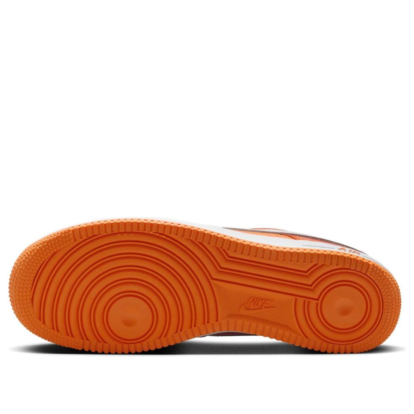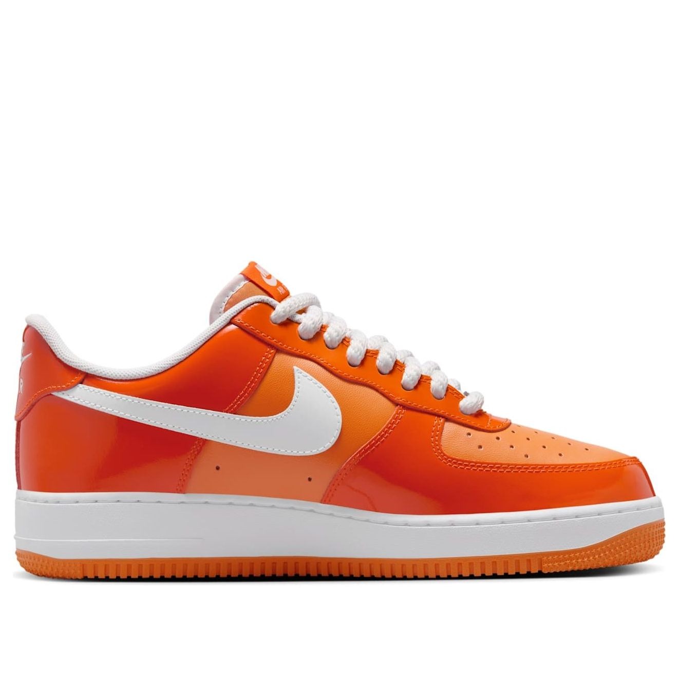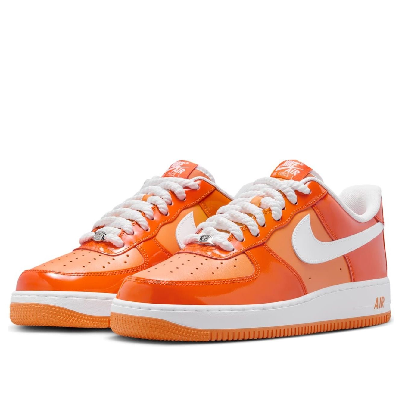 The Nike Air Force 1 Low ’07 Orange White Patent dresses the Air Force 1 Low 07 silhouette in a bright orange and clean white colorway. As a 2007 reissue of the original AF 1 from 1982, the Orange White Patent Nike Air Force 1 Low ’07 maintains its heritage low-top design and bold color-blocking. The underlays are crafted from smooth leather in orange, while the heel and forefoot overlays, the heel tab, and the eyelets are made from shiny orange patent leather. Adding contrast, the rubber outsole, laces, inner lining, and Swoosh logos are displayed in white. Visible branding details include „NIKE“ on the heel tab, „NIKE AIR AIR FORCE 1“ on the woven tongue tag, and „AIR“ on the midsole. Our experts at Newsole like the way white rope replaces the traditional flat laces in the lace cage. The Nike Air Force 1 Low ’07 Orange White Patent was released on December 26, 2024, and retailed at $120.