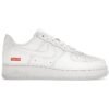 The upper of this Air Force 1 Low is made entirely of white leather, and the soles and details match. The design is finished with a crimson Supreme Box Logo put on the outside heel.