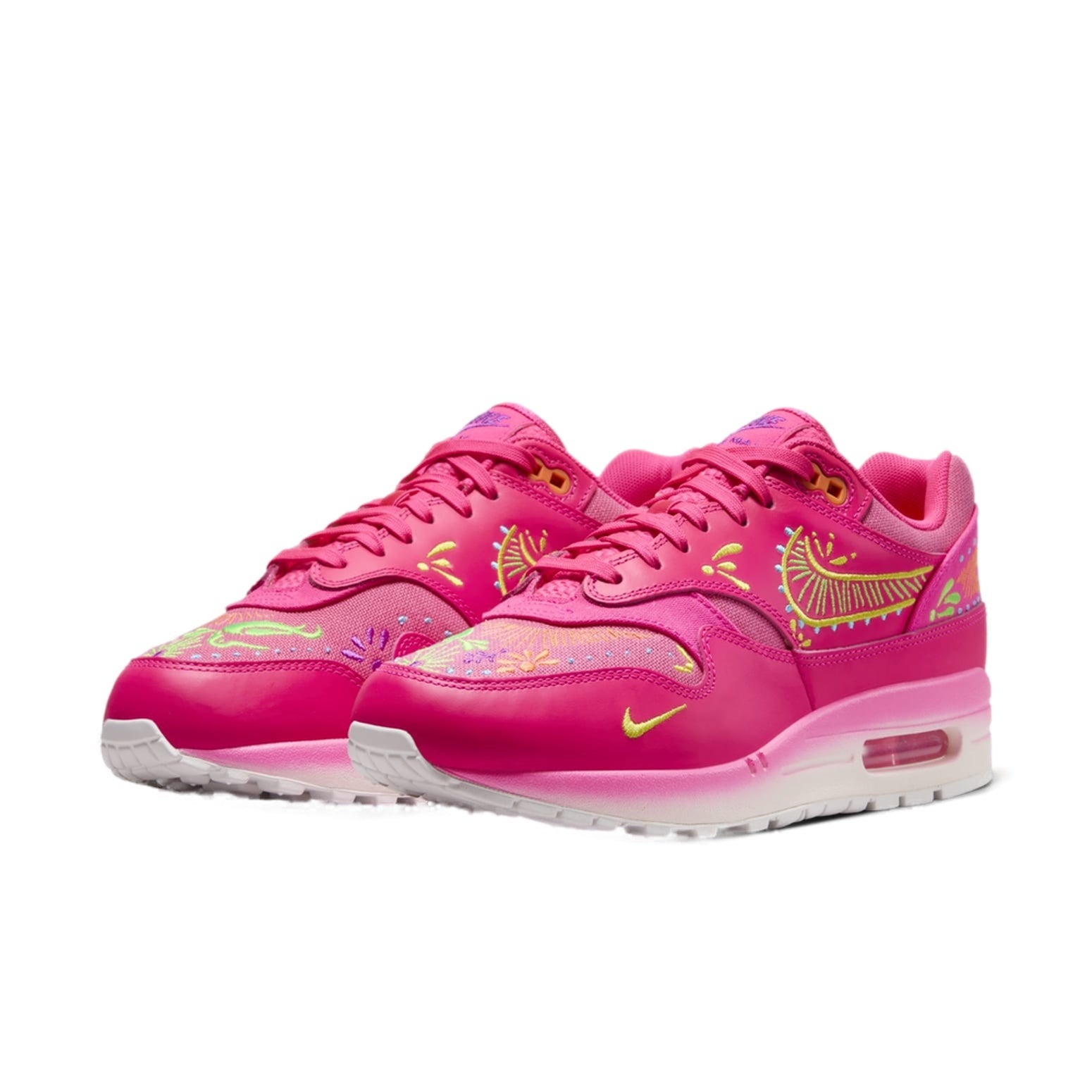 The Nike Air Max 1 PRM D a De Muertos takes the Air Max 1 silhouette and applies Day of the Dead (D a de los Muertos) themed graphics and a vibrant colorway.The sneaker boasts a colorway of Green Strike, Sail, Opti Yellow, and Hyper Pink. Bright pink tones make up the base. The Swoosh on the side, the flower details on the heel, and the swirling designs across the shoe resemble the intricate patterns painted on sugar skulls during the Day of the Dead festivities. The Opti Yellow matches the color of chrysanthemum flowers, and Hyper Pink-like hues are often found on decorations placed on Day of the Dead altars. The upper is mesh, while the overlays and heel panels are crafted from leather.Our experts appreciate how the visible Air Max unit in the midsole matches the upper tones. The Nike Air Max 1 PRM D a De Muertos was released on October 21st, 2023, and retailed at $160.