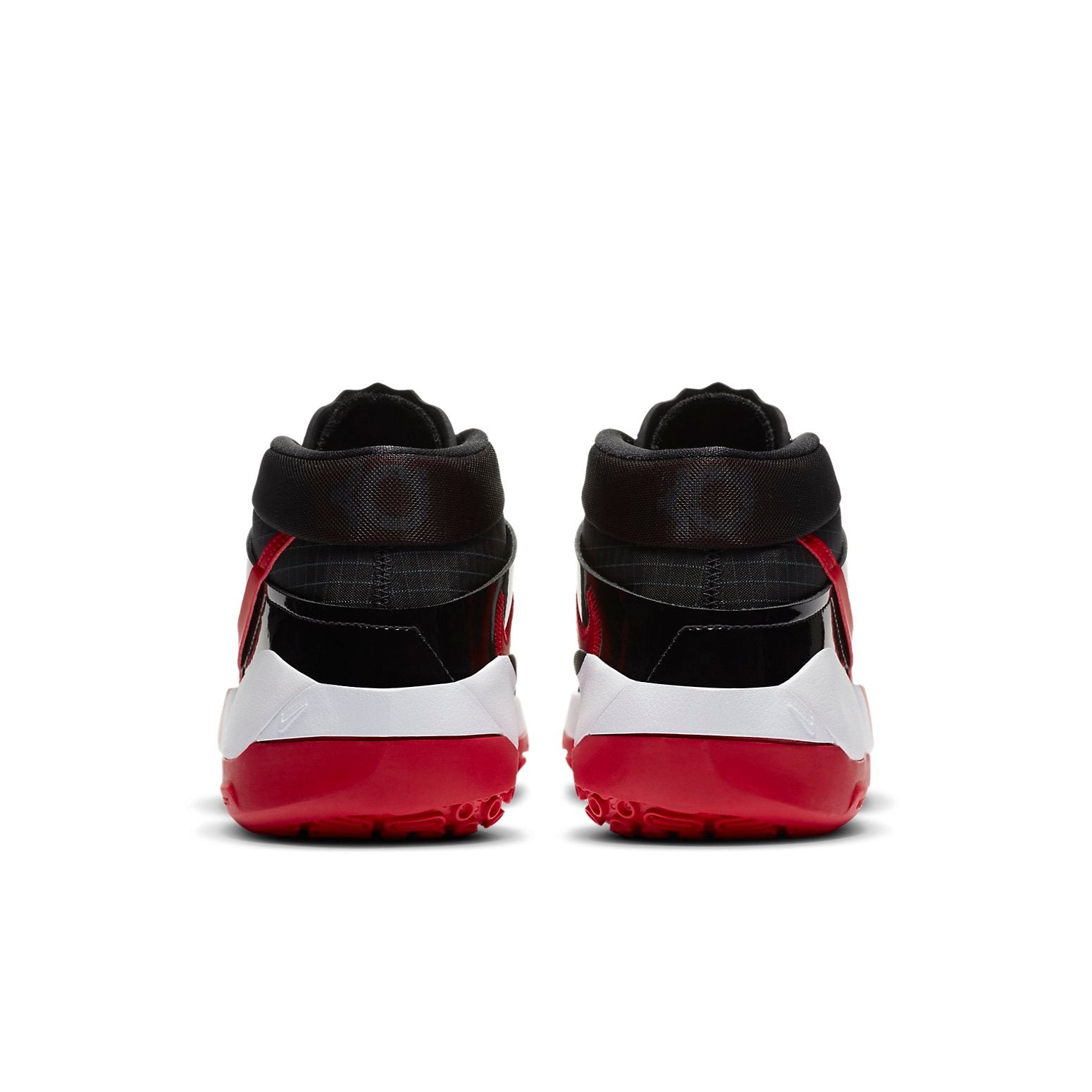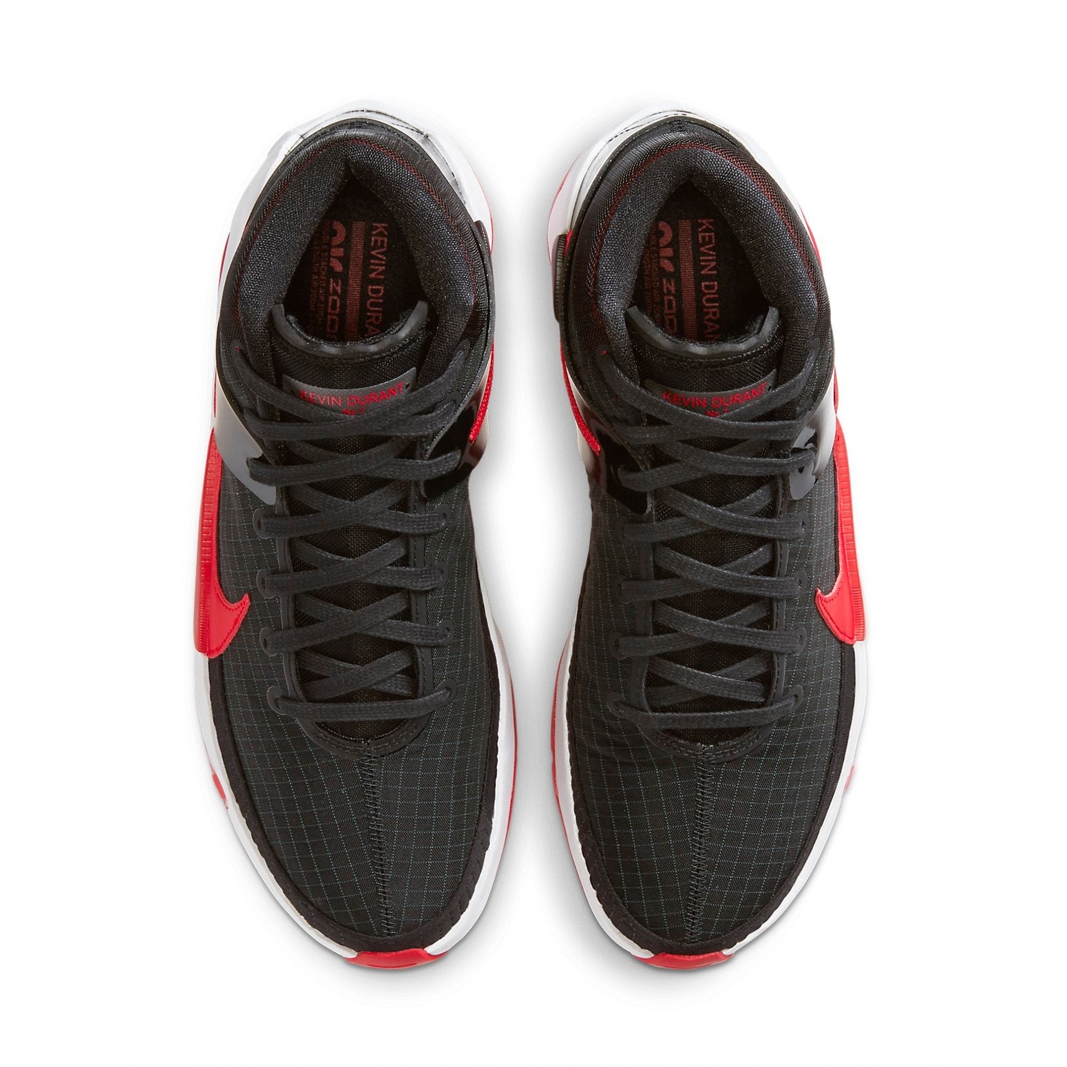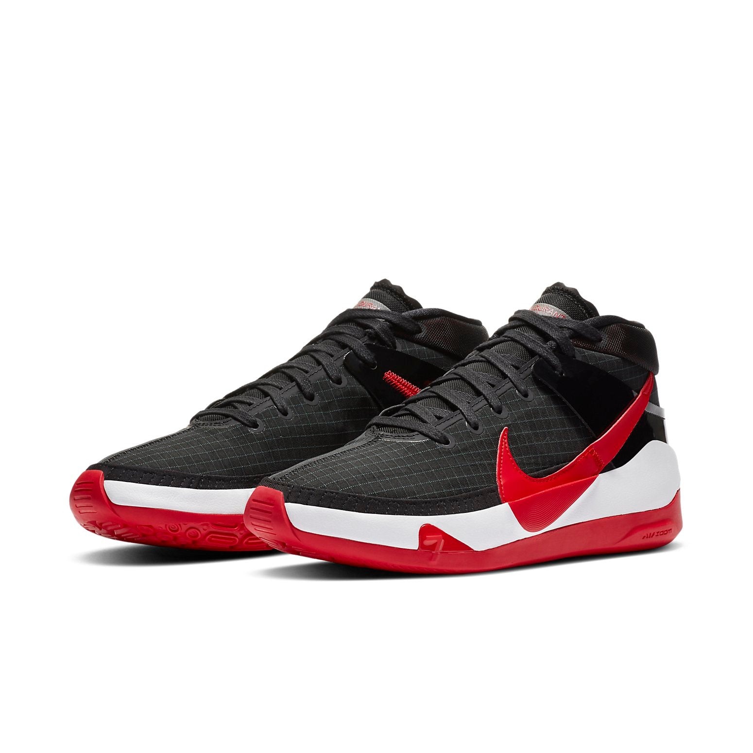 The Nike KD 13 Bred brings a classic color palette to Kevin Durant’s thirteenth signature shoe.The Bred Nike KD 13 mid-top silhouette is constructed with a black textile upper, featuring a striking red leather swoosh that extends down to the white foam midsole. This midsole incorporates a distinctive kidney-shaped Zoom Air unit in the forefoot, complemented by a full-length Zoom Air Strobel unit stitched to the upper for responsive cushioning. The red rubber outsole has a circular traction pattern, featuring visible cut-outs to minimize weight and enhance performance.What our experts love about the Nike KD 13 Bred is its striking and classic colorway that combines black and red hues. This essential color scheme is a signature look that adds a bold and timeless aesthetic to the shoe. It is a standout choice for those who appreciate both style and performance in their basketball footwear. The sneaker was released 5th June 2020 for $150.