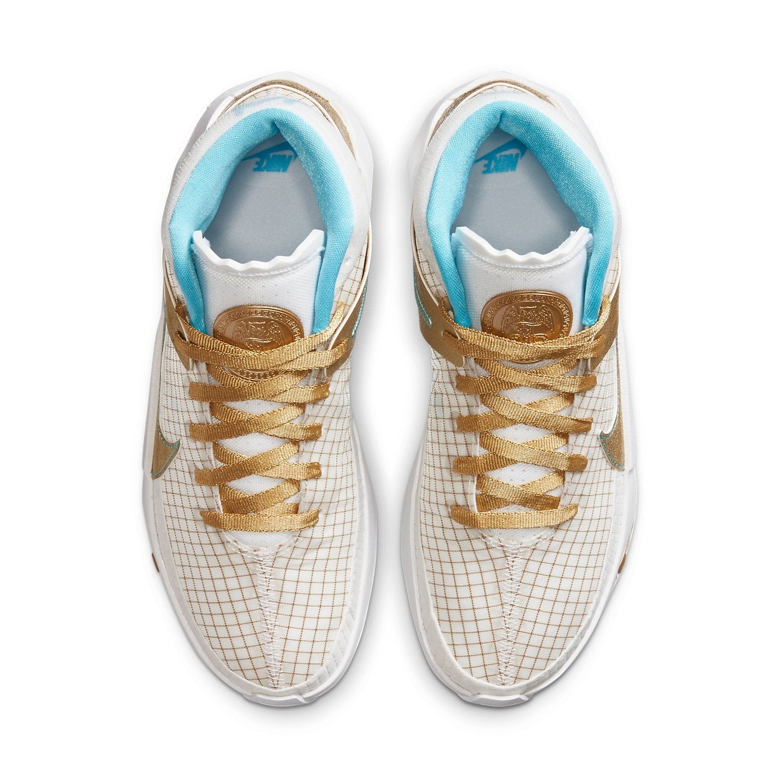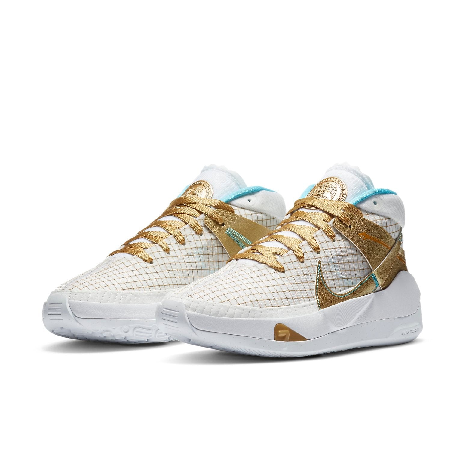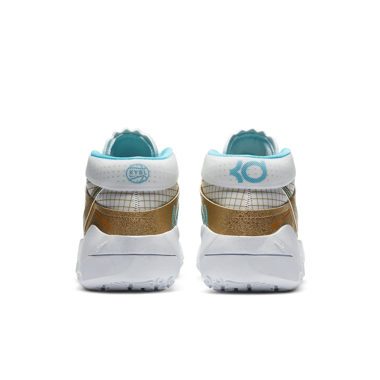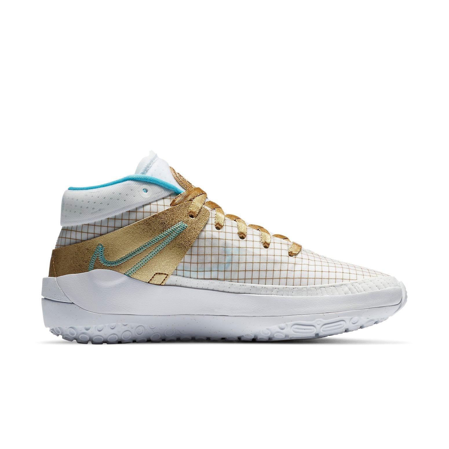 The Nike KD 13 EYBL White (2020) nods to the Elite Youth Basketball League (EYBL) with a white-based makeup detailed with grid patterns. The KD 13 EYBL White utilizes Zoom Air technology in its construction.Right off the bat, the KD 13 EYBL incorporates a textile upper in its construction. The white upper has a grid pattern that complements the metallic gold accents on the Swoosh, heel cage, and laces. Further color arrives on the collar, swoosh, inner lining, and KD imprint on the heel tab. The collar features thick padding for comfort, while a KD logo colored in metallic gold appears on the tongue. The upper rides on a lightweight midsole incorporating a Zoom Air unit designed for lightweight cushioning. Finally, a grippy rubber outsole steps in to deliver traction and support the lightweight upper.What our experts love about the KD 13s is the hidden Zoom Air unit in the midsole. The Nike KD 13 EYBL White (2020) was released on July 27, 2020, retailing for $150.
