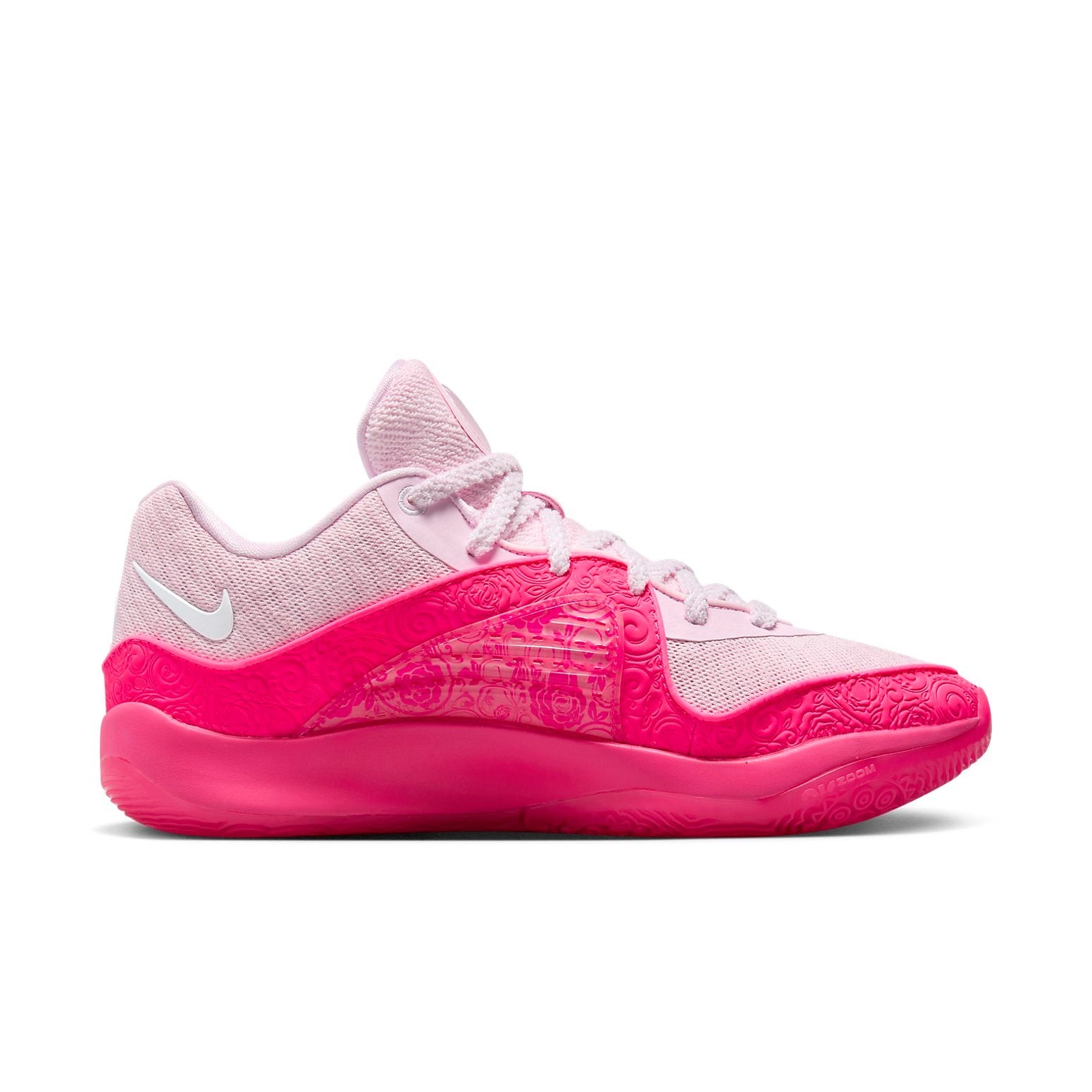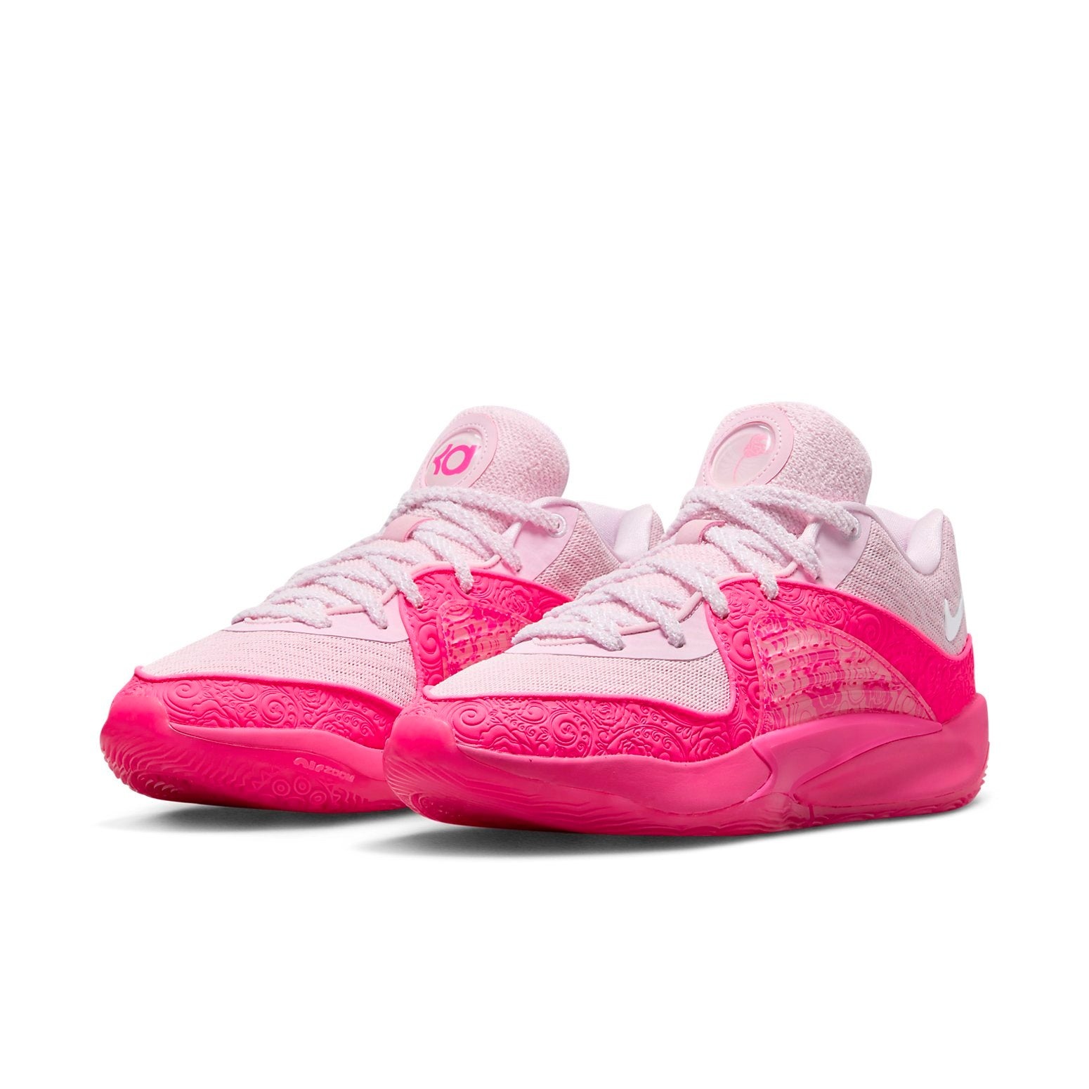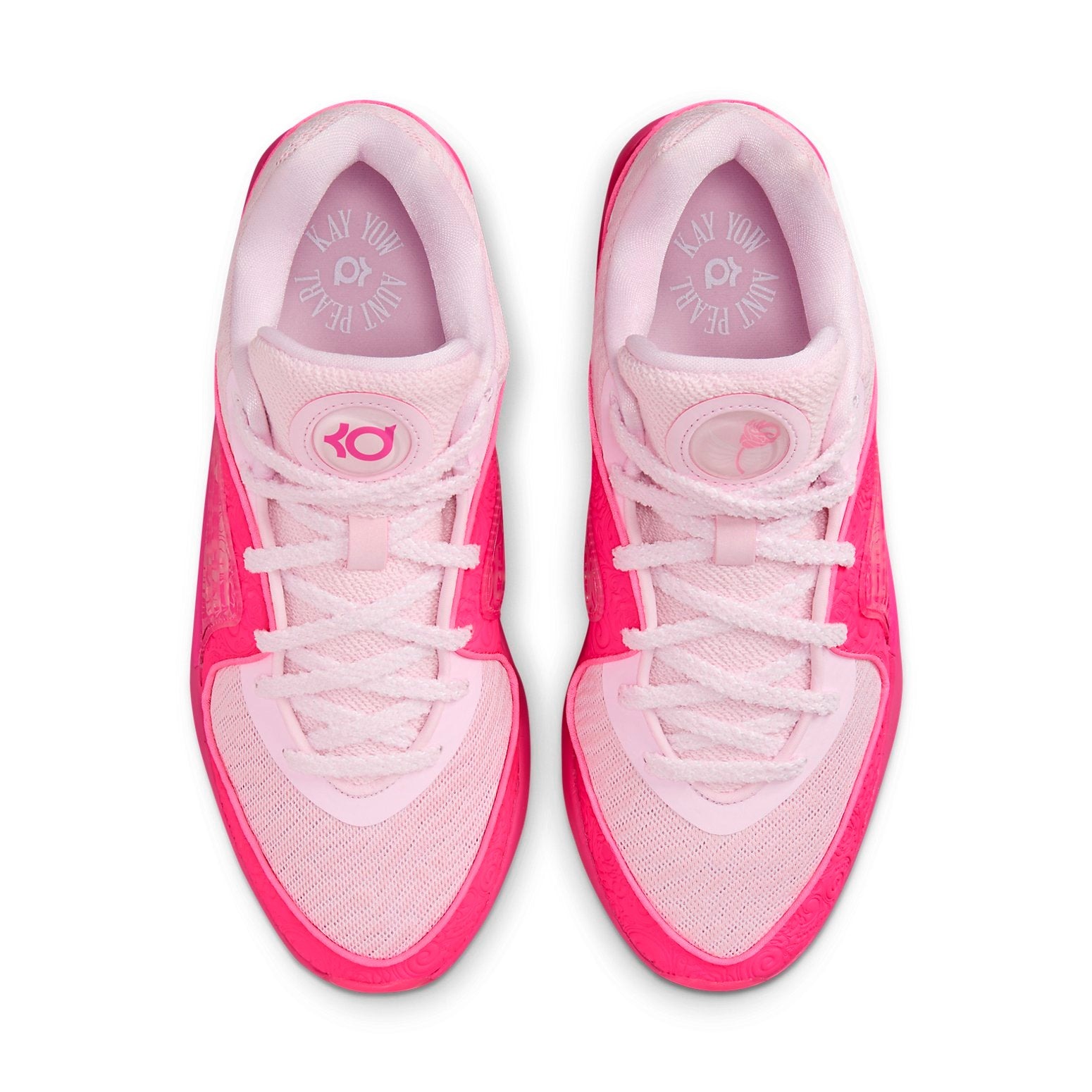 The Nike KD 16 NRG Aunt Pearl continues the tradition of paying tribute to Kevin Durant s Aunt Pearl, who offered support in his formative years and lost her battle with lung cancer in 2000.This sneaker stands out from other „Aunt Pearl“ variations due to the floral-debossed overlay which covers the mesh upper and features a paisley pattern. Durable TPU support wings connect to the midsole and boast rose-like blooms beneath a transparent seal. The Phylon midsole comes with a Zoom Air unit in the forefoot and a responsive Air Strobel unit beneath the heel. The sneaker features a primarily pink colorway of White, Fierce Pink, Pink Foam, and Hyper Pink.Something our Newsole experts love is the addition of fuzzy laces. These light-hued laces complement the textile-like mesh of the upper and the woven material that makes up the tongue. The Nike KD 16 NRG Aunt Pearl was released on October 27, 2023, and retailed at $170.