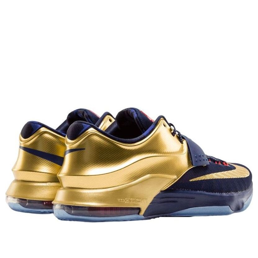 The Nike KD 7 Gold Medal features a Midnight Navy/Metallic Gold-Bright Crimson colorway. This Nike KD 7 was first released for $170 on November 22, 2014.