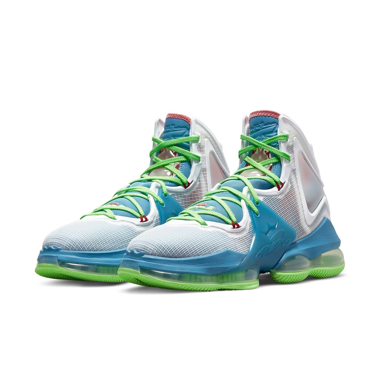 The Nike LeBron 19 Dutch Blue Lime Glow was released to mark the nineteenth time Nike collaborated with NBA champion LeBron James.Starting with a feature-full sole, the transparent Air Max unit on the Nike LeBron 19 is visible from any angle. Besides a Zoom Air unit on the underfoot, the lime glow rubber outsole is adorned by a blade pattern enabling multi-directional maneuver. A translucent mesh upper meets an intricate lacing system with lime glow laces strapped via gym red Flywire cables and a Dutch Blue overlay on the quarter panels. Transparent molding appears on the ankles and a heel counter adorned by a white pull tab.Newsole experts love the 360-degree visible Air Max on this shoe. Further, we adore the generously applied branding, including LeBron James-inspired crowns on the tongue, underfoot, and lateral quarters and swooshes on the medial sides and heel. The Nike LeBron 19 Dutch Blue Lime Glow was released on April 1st, 2022, for $200.