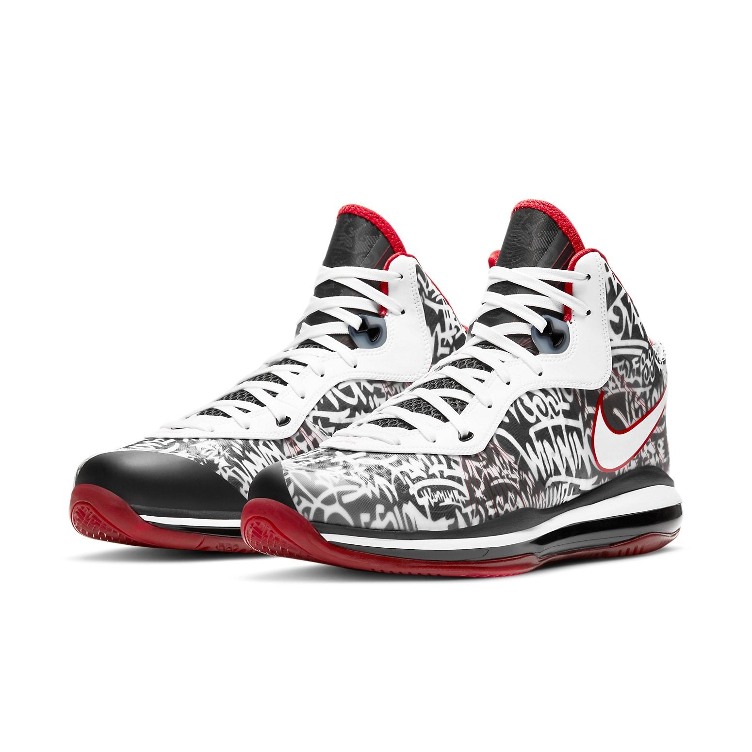 The Nike LeBron 8 Graffiti is a highly sought-after basketball shoe that combines style and performance. Released on January 23, 2021, this shoe features a black and white graffiti print on the upper, with hits of red on the tongue and outsole. The shoe is made with a mix of leather, synthetic materials, and mesh for durability and breathability. The midsole is equipped with Nike’s signature Air technology for cushioning and support, while the outsole provides traction on the court. The shoe is priced at $200 and is a must-have for fans of LeBron James and sneakerheads alike. Don’t miss out on this limited edition release, available now on Newsole.