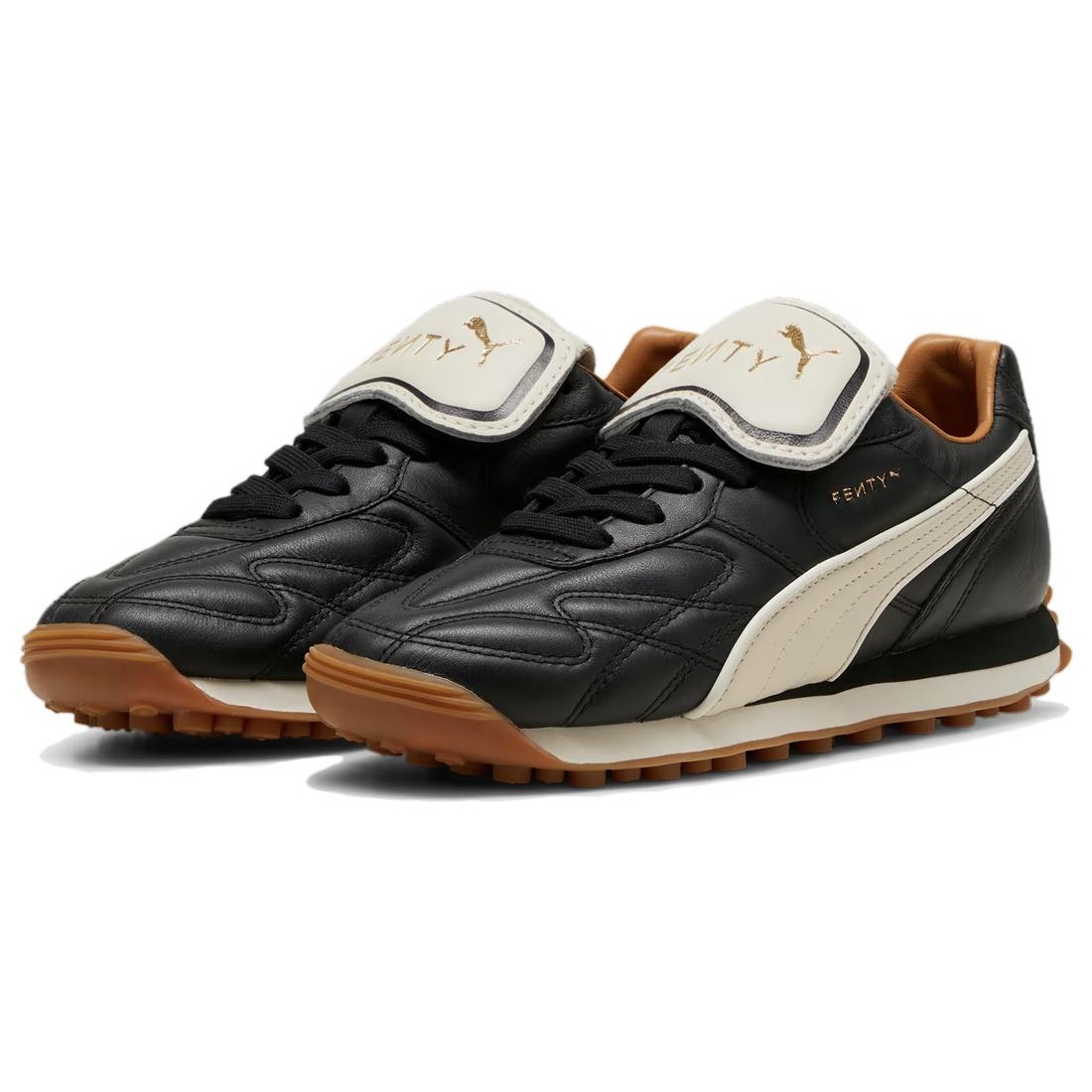 FENTY x PUMA presents the Avanti, worn by legends and reborn by Rihanna. This classic silhouette was taken from the PUMA archives and reimaged by Rihanna through her own personal design language and creative treatment. This new sport-fashion icon features a premium leather upper and a gum sole, and appears in two bespoke versions: classic black and white, and allover silver chrome. Buttery soft leather upper ; Leather piping around formstrip ; Attached fold over tongue in soft leather ; Debossed Fenty logo on tongue, quarter, and heel with gold foil finish ; Brown leather lining ; EVA foam wedge midsole ; Gum outsole.