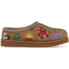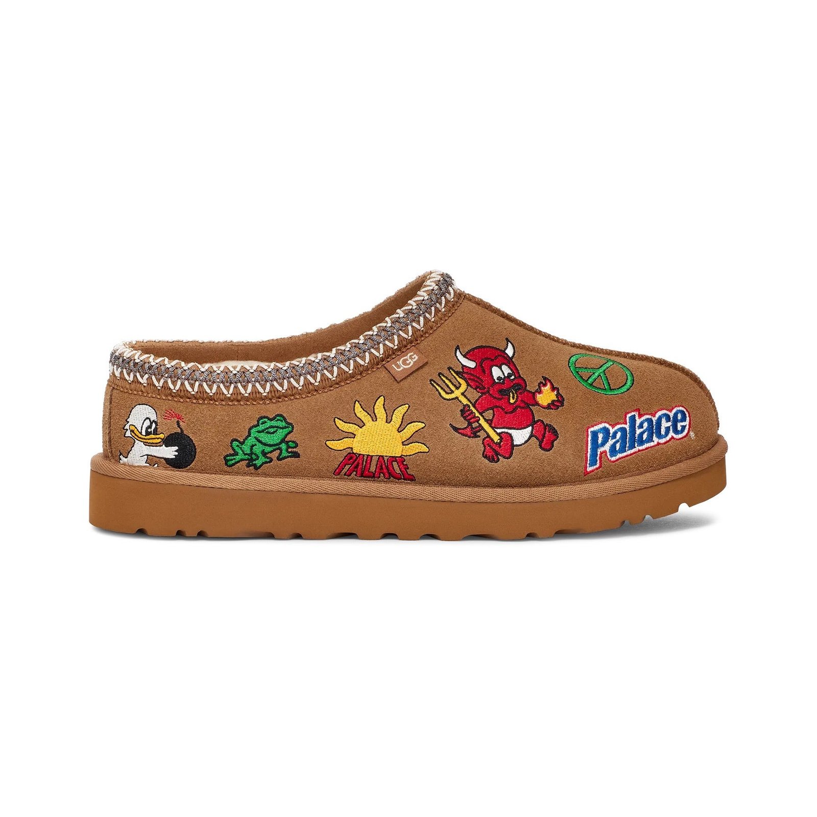 A fusion of patchwork aesthetics and comfort defines the unexpected collaboration, adorning the UGG Tasman Slipper Palace Chestnut with animated characters, symbolic elements, and Palace branding.The Palace Chestnut UGG Tasman Slipper showcases a conventional suede upper, a plush sheepskin lining, and an UGGpure wool insole. Notably, the design is adorned with embroidered patches featuring a devil, frog, sun, peace sign, and the Palace logo across the front. Adding a touch of refinement, the Tasman braid on the collar enhances the overall sophistication of the slipper. Additionally, the slipper boasts UGG’s signature cozy fluffy inners and a vintage style double stitch along the collar.The most notable factor of the UGG Tasman Slipper Palace Chestnut lies in its embroidered patches. This distinctive element, coupled with the Tasman braid on the collar, imparts a unique and captivating aesthetic to the slipper. The slipper was originally sold for $190 on December 1st, 2023.