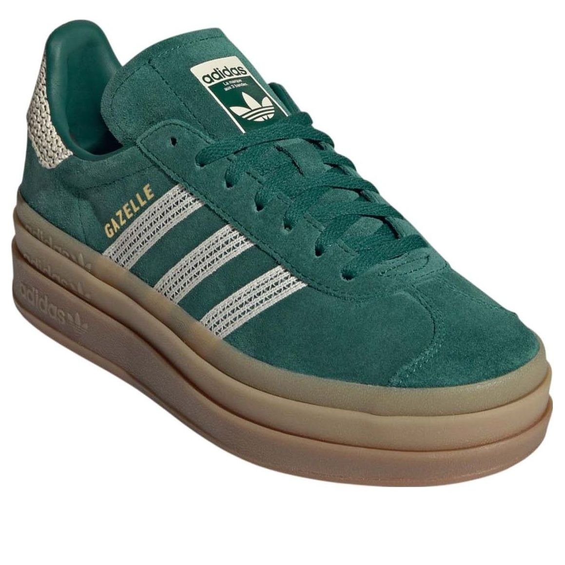 The adidas Gazelle Bold Collegiate Green White Gold (Women’s) features a Collegiate Green/Wonder White/Gold Metallic colorway. This adidas Gazelle Bold was first released for $120 on December 06, 2024.