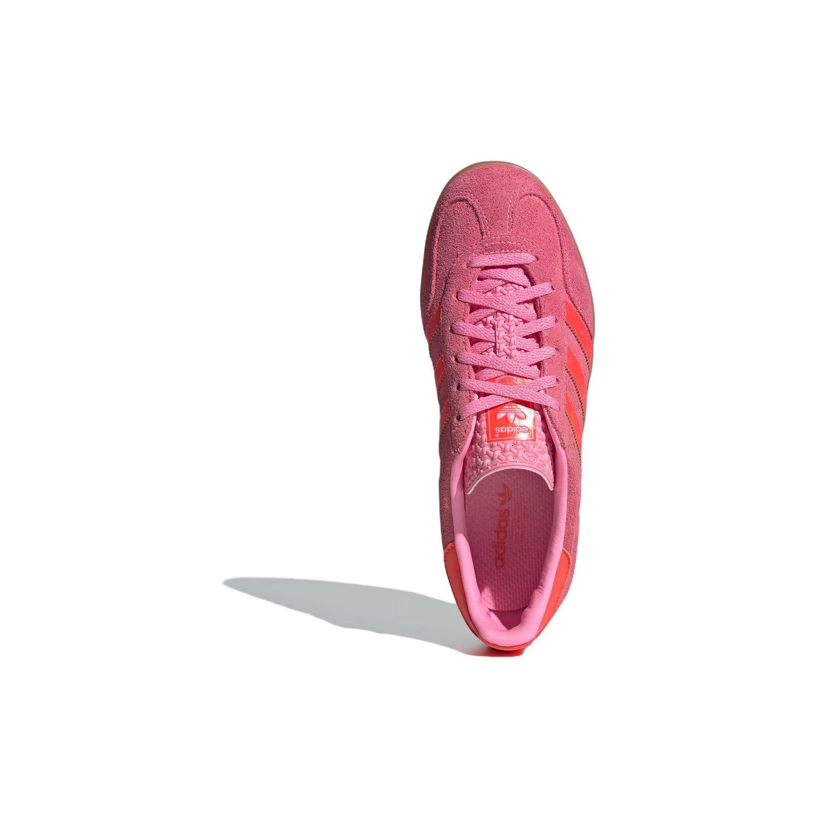 The adidas Gazelle Indoor Beam Pink (Women s) is an indoor athletic shoe in women s sizing with a bright colorway.This version of the adidas Gazelle Indoor is made with a suede upper in a shade of pink. This color dominates most of the shoe, with an overlay around the toebox and running up under the laces in one shade lighter. The iconic adidas three stripes appear across the midsole in leather in an even brighter pink, while the word « GAZELLE » appears in shiny gold on the lateral side next to the first stripe. The heel collar also appears in bright pink leather to match the stripes, and the tongue is textured pink with an adidas logo patch. A classic gum rubber outsole completes the look.What stands out about this shoe is the bright pink colorway. This monochromatic look is bold. The adidas Gazelle Indoor Beam Pink (Women s) was released on January 1, 2024, for a retail price of $120.