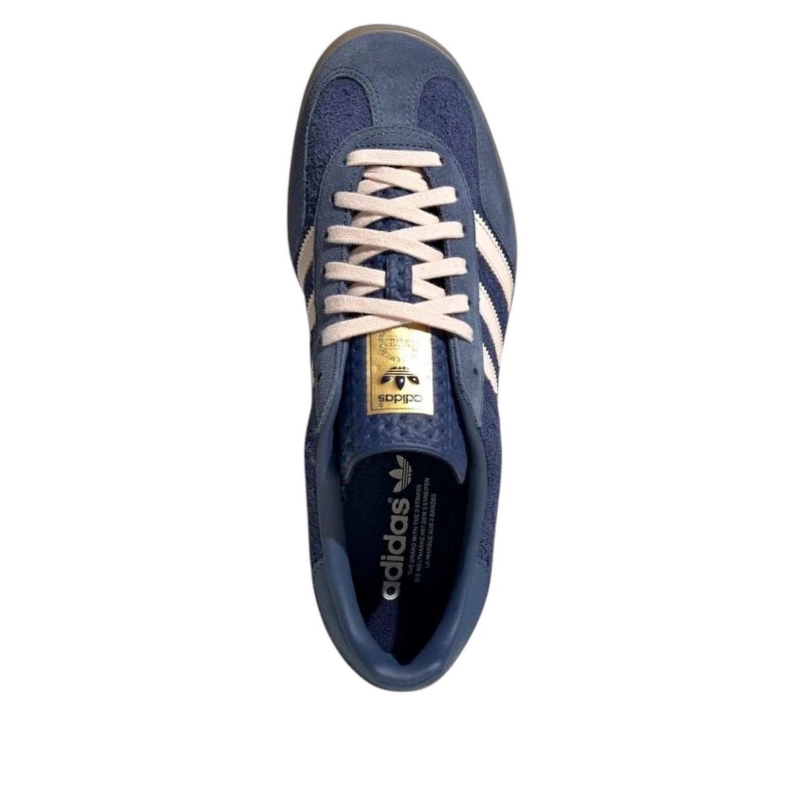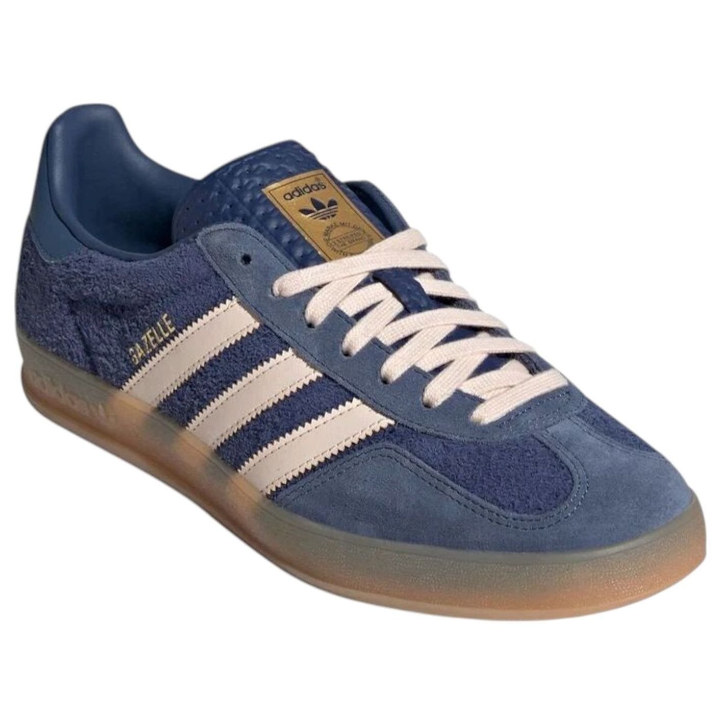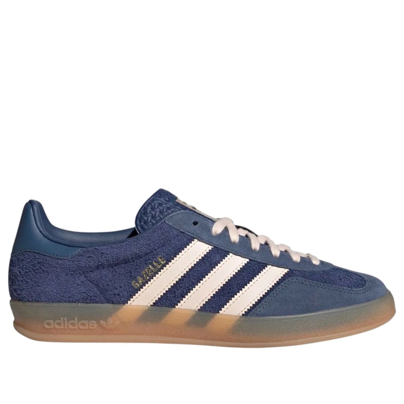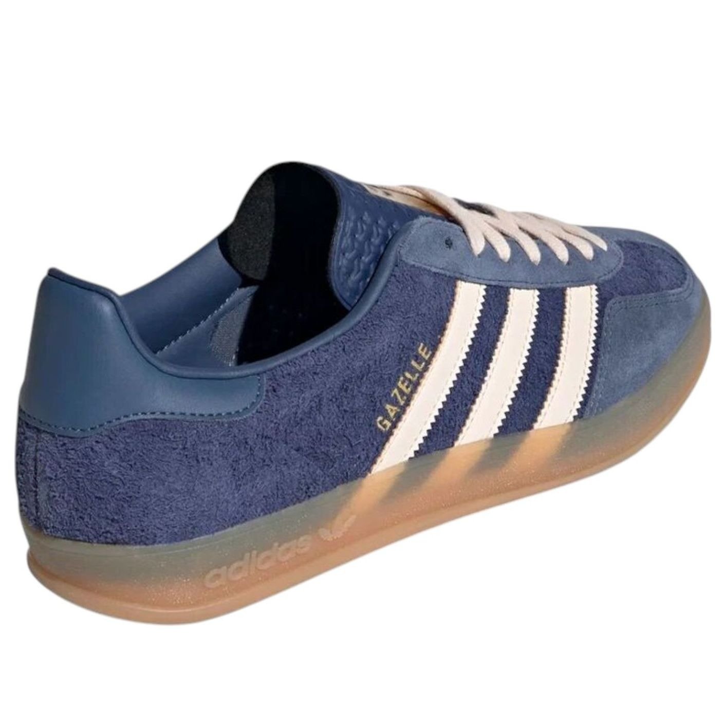 The adidas Gazelle Indoor Dark Blue Bliss Orange blends a modern dark blue, bliss orange and preloved ink color colorway with the iconic 1960s design of the adidas Gazelle Indoor silhouette.This low-top profile exudes classic, timeless aesthetic. The dark blue upper is made from natural leather and synthetic materials. A furry texture, like a terry cloth towel, covers most of the upper, while smooth lighter blue overlays adorn the toe cap and eyelet. The collar is padded for durability where the heel rubs most, while the perforated tongue boasts a bliss orange adidas branded patch. White flat laces match the three white stripes with jagged detailing on the side panels.In our opinion, a standout feature of the adidas Gazelle Indoor Dark Blue Bliss Orange colorway would have to be the gum-colored mudguard with embossed adidas branding on the side that doubles as the outsole with adidas trefoil lugs underfoot. Originally released on August 23, 2024, this shoe was priced at $120 retail.