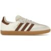 The Cream White Preowned Brown variant, which joins the lineup of adidas Samba original models in neutral colorways, has an upper made of suede, cloth, and smooth leather. The base is Cream White, with Preloved Brown accents drawing attention to the serrated 3-Stripes emblem and the heel mustache. A textural contrast is created by the Wonder White suede eyelets and toe box overlay. The fabric interior keeps the foot comfy, and the gum rubber outsole completes the design by providing a sticky sensation.