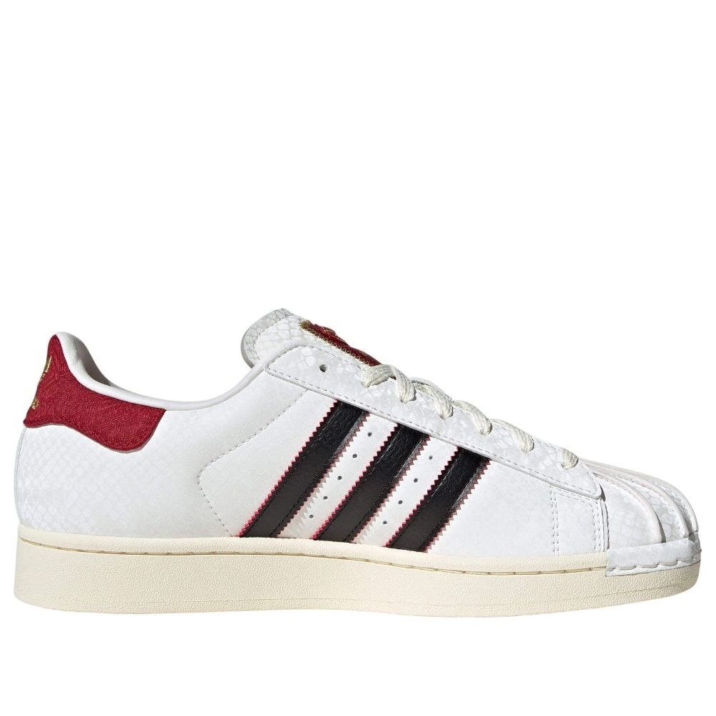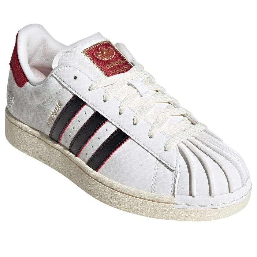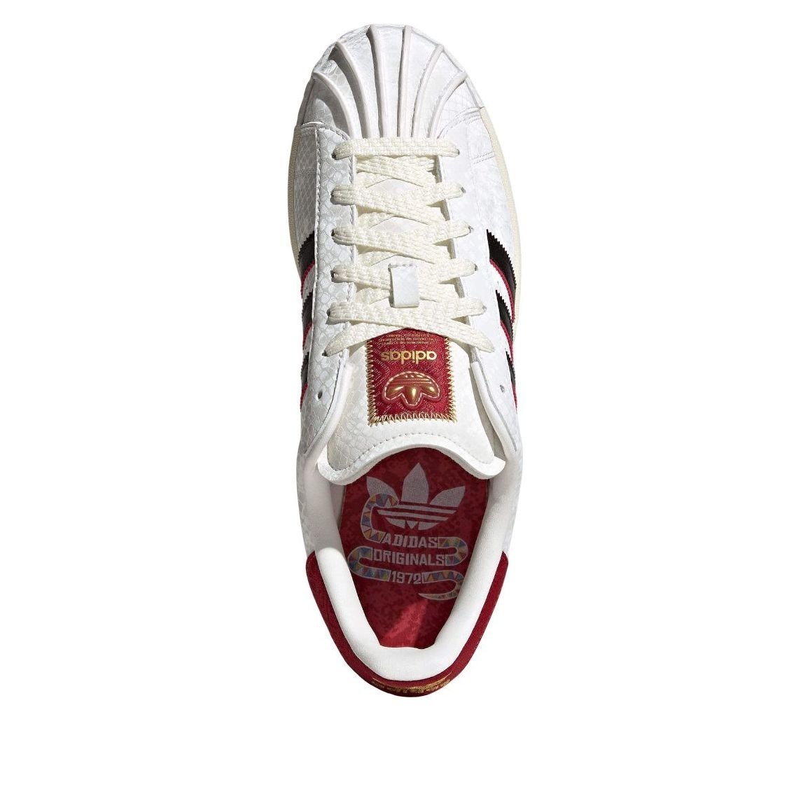 The adidas Superstar Year of the Snake features a Cloud White/Core Black/Active Maroon colorway.