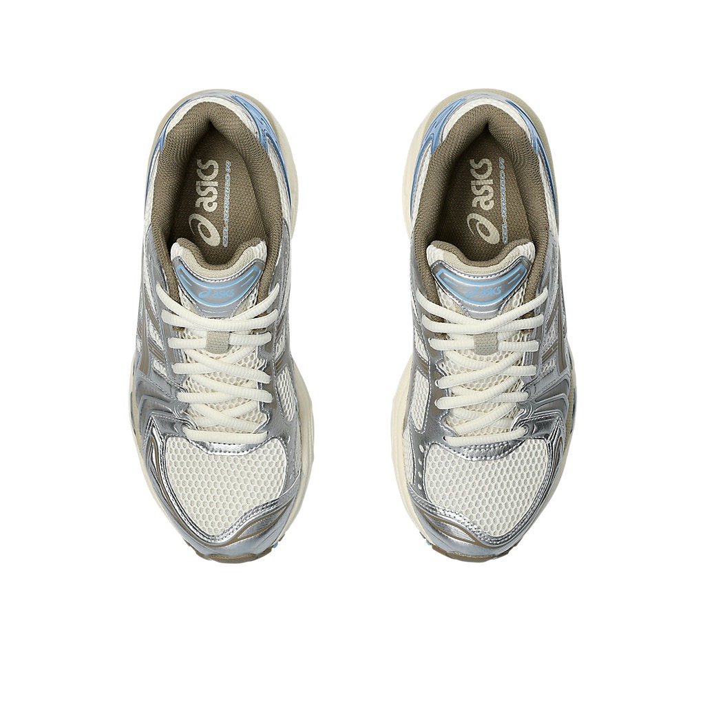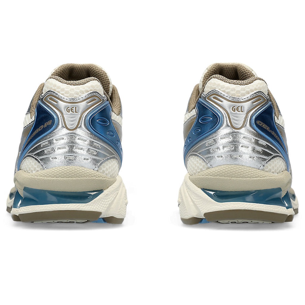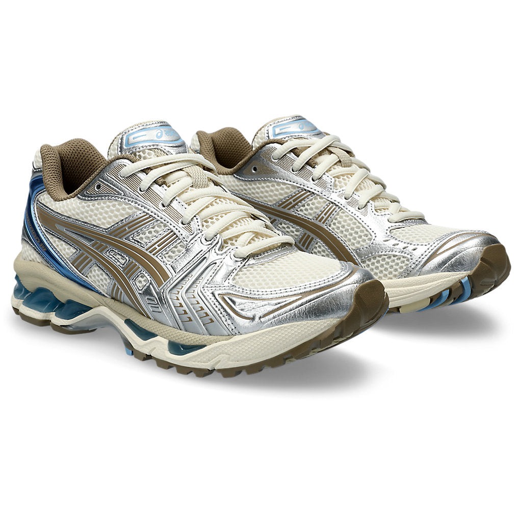 The ASICS Gel-Kayano 14 Cream Pepper (Women’s) is a shoe in women s sizes designed for performance running and inspired by the explosion of lightning. This iteration of the ASICS Gel-Kayano 14 is made with an upper of breathable white mesh in a Cream shade. Silver artificial leather overlays form the toe cap and outline the toe box, while also forming the eyestays and the heel. The ASICS classic design crosses the sides of the shoe in Pepper overlays, while the tongue bears an ASICS logo. There are metallic-blue overlays on each side of the ankle that run back to the heel, and the silver overlay on the heel contains Gel branding. Gel technology is visible underfoot in the midsole in blue, and a Pepper rubber outsole completes the look. What we like best about this sneaker are the metallic-blue overlays, which add a touch of color to the otherwise neutral tones of the shoe. The ASICS Gel-Kayano 14 Cream Pepper (Women’s) was released on March 1, 2024, for $150.