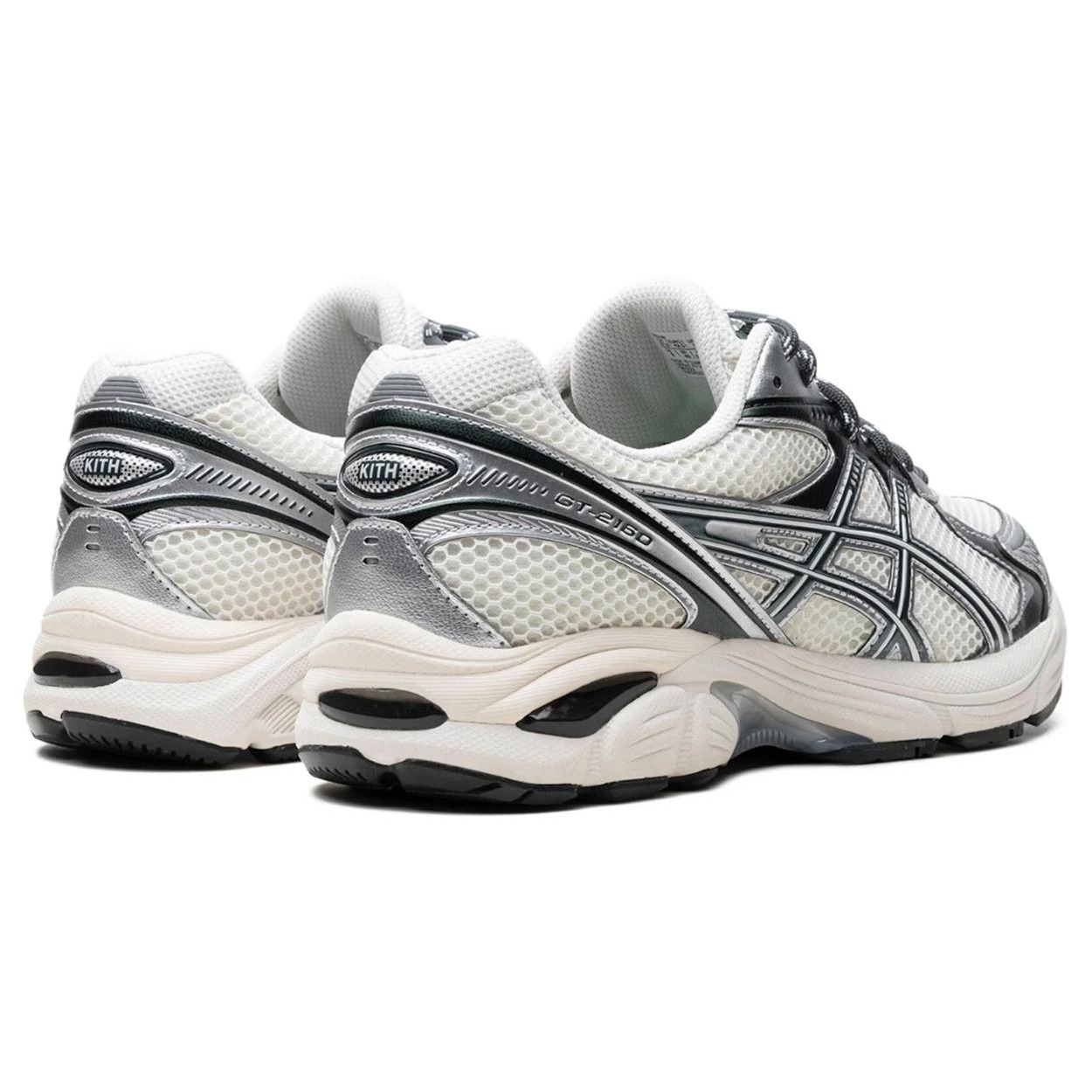 The ASICS GT-2160 Kith Cream Scarab (2024) is a reissue of the ASICS GT-2160 created in partnership with New York City-based lifestyle brand Kith. In keeping with Kiths house codes, this technical running shoe boasts a Cream base with synthetic leather overlays in dark Green Scarab and metallic silver. Covering the side panels, the signature ASICS tiger stripes come in the same tones and support the mesh upper. The ultra-lightweight EVA midsole offers comfort, while the Gel insert absorbs shock beneath the heel. Completing the technical look, the durable rubber outsole features an advanced traction pattern and houses a TPU shank. This shank increases stability in the midfoot without weighing down the shoe. Our experts at Newsole appreciate the way the streamlined silhouette and the subtle colorway complement each other. The ASICS GT-2160 Kith Cream Scarab (2024) was released on March 28, 2024, and sold for $140.