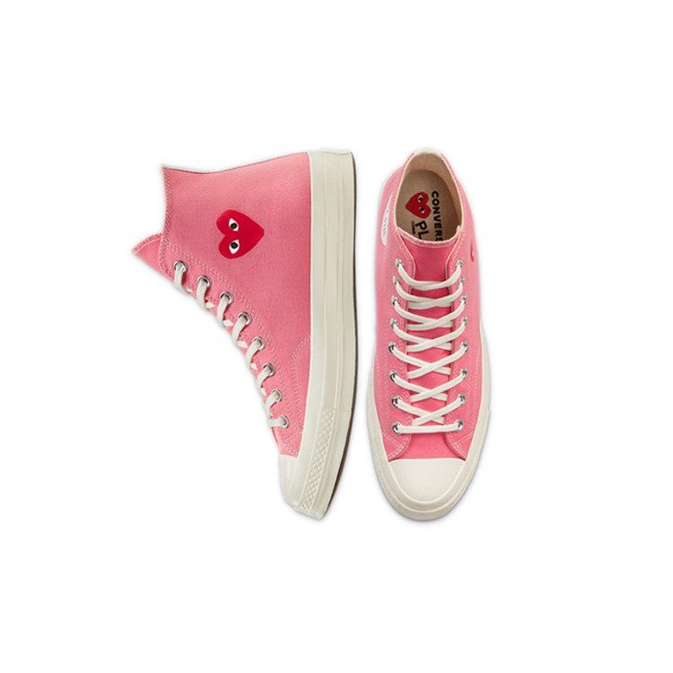 The Converse Chuck Taylor All-Star 70 Hi Comme des Garcons Play Bright Pink was released as part of a collaboration between Converse and the Comme des Garcons PLAY men s line of clothing.The All-Star 70 Hi Comme des Garcons Converse Chuck Taylor Play Bright Pink features a bright pink colorway. The upper of the shoe is crafted from high-quality canvas material, which is both durable and comfortable. The outsole is made from rubber and features the Chuck Taylor All Star design, offering traction and durability.What do we love about the Converse Chuck Taylor All-Star 70 Hi Comme des Garcons Play Bright Pink? It is the iconic heart-shaped logo with two eyes that is placed prominently on the side of each shoe. This heart logo is the signature design element of the Comme des Garcons PLAY line. The playful design adds a touch of whimsy and fun to the classic Chuck Taylor style. The Converse Chuck Taylor All-Star 70 Hi Comme des Garcons Play Bright Pink was released on April 2nd, 2020, at a retail price of $150.