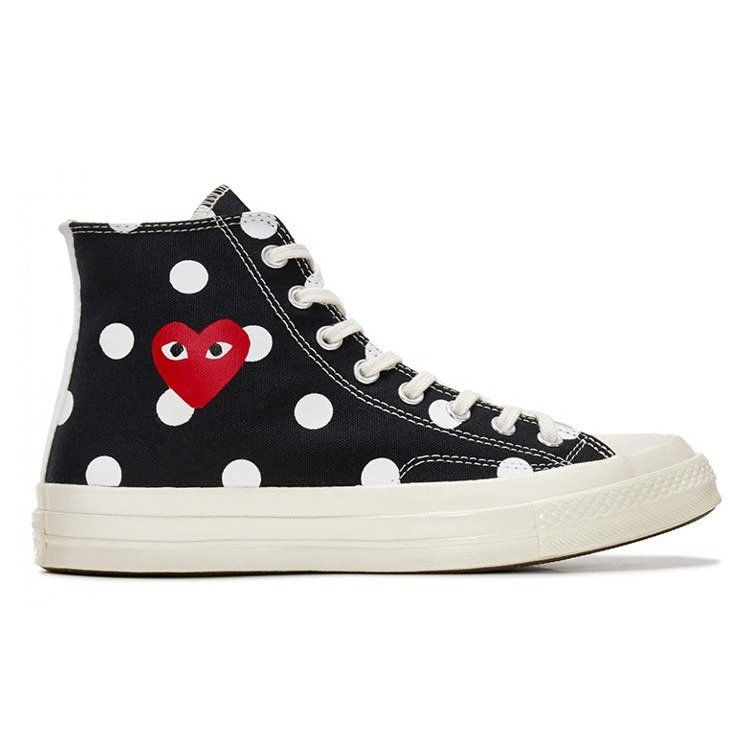 The Converse Chuck Taylor All-Star 70 Hi Comme des Garcons PLAY Polka Dot Black is a special edition sneaker that was released as part of a collaboration between Comme des Garcons and Converse.The Hi Comme des Garcons PLAY Polka Dot Black and Converse Chuck Taylor All-Star 70 is a unique take on the classic Chuck Taylor All-Star 70s design. The shoe has a polka dot pattern that covers the upper in black and white. It features a lace-up closure and a rubber toe cap, a textured rubber outsole, and the Comme des Garcons logo is featured on the heel of the shoe, along with the iconic Converse All-Star logo on the side.The Converse Chuck Taylor All-Star 70 Hi Comme des Garcons PLAY Polka Dot Black was released on October 6, 2017 at a retail price of $135.