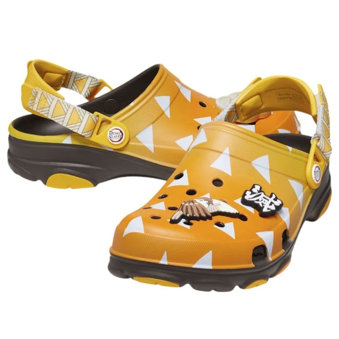 The Crocs Classic All-Terrain Clog Demon Slayer Zenitsu brings the world of anime to life with its collaboration inspired by Demon Slayer. This orange-colored clog features design elements that pay homage to the character Zenitsu Agatsuma, a fan favorite from the series. The bold orange hue, combined with black and yellow accents, mirrors Zenitsu s iconic look, making this clog a must-have for anime enthusiasts. The Classic All-Terrain Clog offers Crocs signature comfort with a more rugged design, featuring a durable Croslite foam construction and an adjustable turbo heel strap for added stability. Ventilation ports provide breathability, while the sturdy outsole ensures traction on various surfaces. This edition also includes custom Jibbitz charms inspired by Demon Slayer, allowing for further customization and a fun, personal touch. Released on October 18, 2023, the Crocs Classic All-Terrain Clog Demon Slayer Zenitsu retailed for $70. This anime-inspired collaboration offers a unique blend of functionality and fandom, making it perfect for Demon Slayer fans who appreciate comfort and style in their everyday footwear.