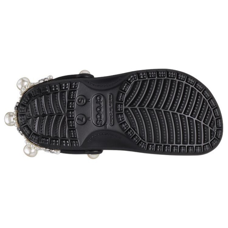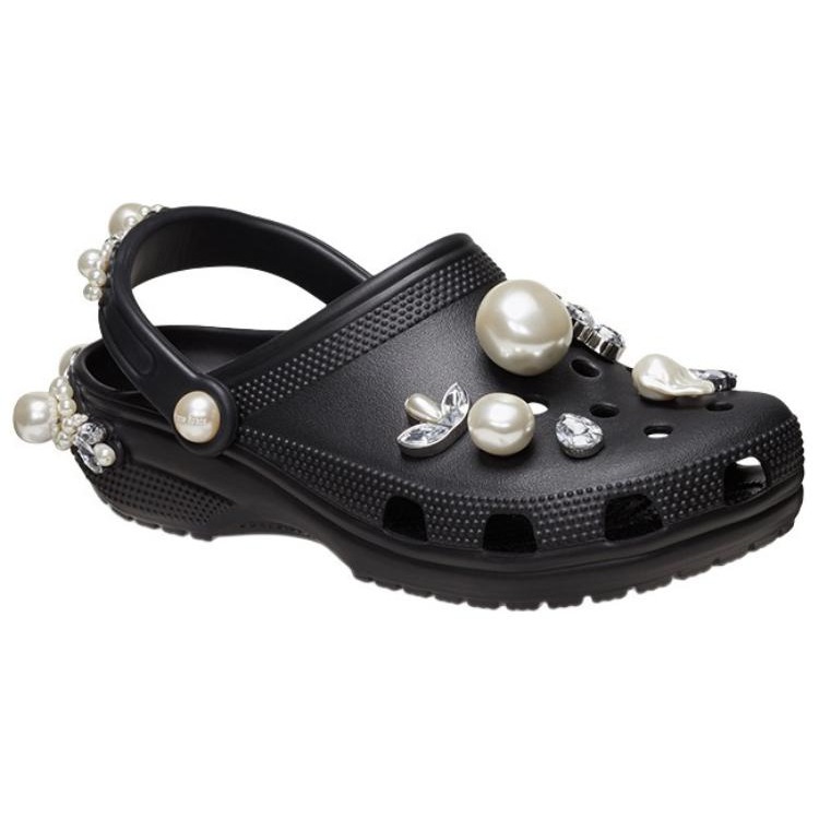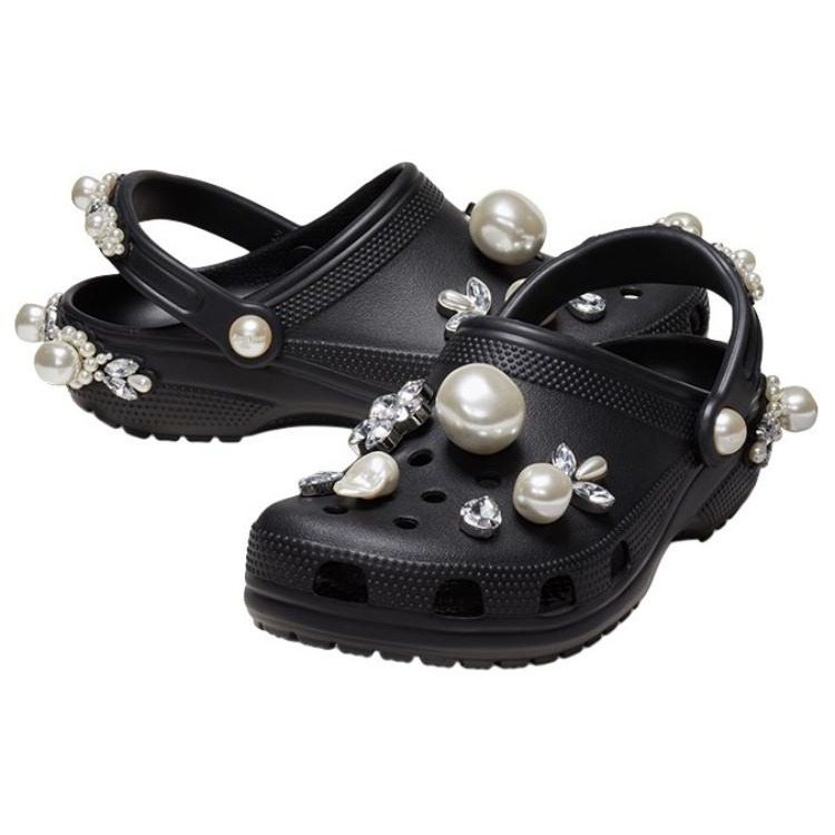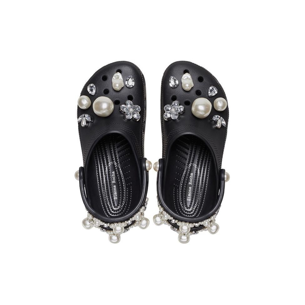 The Crocs Classic Clog Simone Rocha Black is a sophisticated collaboration between Crocs and Irish designer Simone Rocha, known for her romantic and intricately detailed designs. This version of the classic clog incorporates Rocha s signature embellishments, elevating the everyday Crocs silhouette into something more glamorous. The all-black colorway provides a sleek backdrop for the delicate details that Simone Rocha brings to the table, making this pair both practical and fashionable. The Classic Clog retains its lightweight Croslite construction, ensuring all-day comfort, while the addition of Rocha s luxurious elements such as pearls and translucent accents brings a high-fashion twist to the functional design. The adjustable strap and roomy fit keep it true to the original Crocs comfort, but with a refined, couture appeal. It s perfect for those who want a balance of comfort and runway-ready style. Released on April 10, 2024, the Crocs Classic Clog Simone Rocha Black retailed for $175. This collaboration blends practicality with luxury, making it ideal for fashion enthusiasts who appreciate the juxtaposition of high-end details with everyday ease.