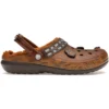 The Crocs Classic Lined Clog Star Wars Chewbacca takes an iconic silhouette and dresses it in colors and fabrics that honor the iconic Star Wars character, Chewbacca. This cozy classic works as a slipper and outdoor footwear.The Star Wars x Crocs Classic Lined Chewbacca Clog is composed of Croslite foam throughout, on the upper as well as the sole unit. The upper is brown with darker brown and black patterning that mimics the Wookie s fur. Large perforations on the toebox allow for breathability, as well the attachment of Jibbitz charms to decorate the shoe to your liking. A strip of geometrical patterning over the arch of the foot recalls the signature bandolier Chewbacca always wears. A pivoting heel strap allows for comfort and features Chewbacca’s name. The darker brown sole features grooves for traction. What we enjoy most about this shoe is the addition of the brown fuzzy lining that recalls Chewbacca s fur and offers warm comfort. The Crocs Classic Lined Clog Star Wars Chewbacca was released on August 14, 2023, for $70 retail.