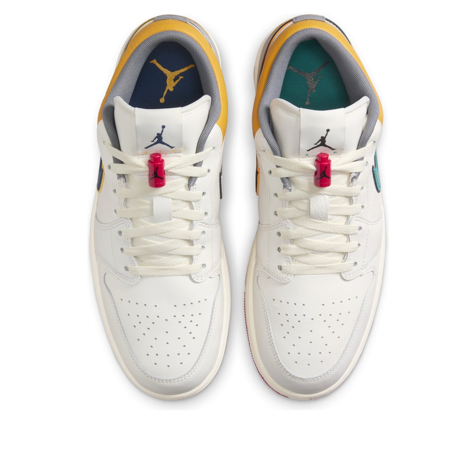 The Jordan 1 Low PRM Sail Cashmere dresses the iconic Air Jordan 1 Low silhouette in a neutral Sail and Cashmere colorway with mismatched accents in blue, yellow, and College Grey. Originally designed as a low-top basketball shoe, this version of the AJ 1 low features a premium leather construction with the base, overlays, and eyelets all crafted from the same material. This low-top sneaker, featuring AIR capsules in the soles, also boasts another noteworthy element: plastic lace locks attached to the laces. Borrowed from the Air Jordan 5 and 6, these lace toggles secure the fit and add a pop of red that matches the rubber outsole. Our experts at Newsole appreciate the contrasting colors on the Swoosh logos. For instance, the left shoe showcases a teal and black Swoosh, while the right shoe has a white and blue Swoosh. The Jordan 1 Low PRM Sail Cashmere was released on February 1, 2025, and sold for $155.
