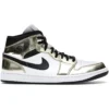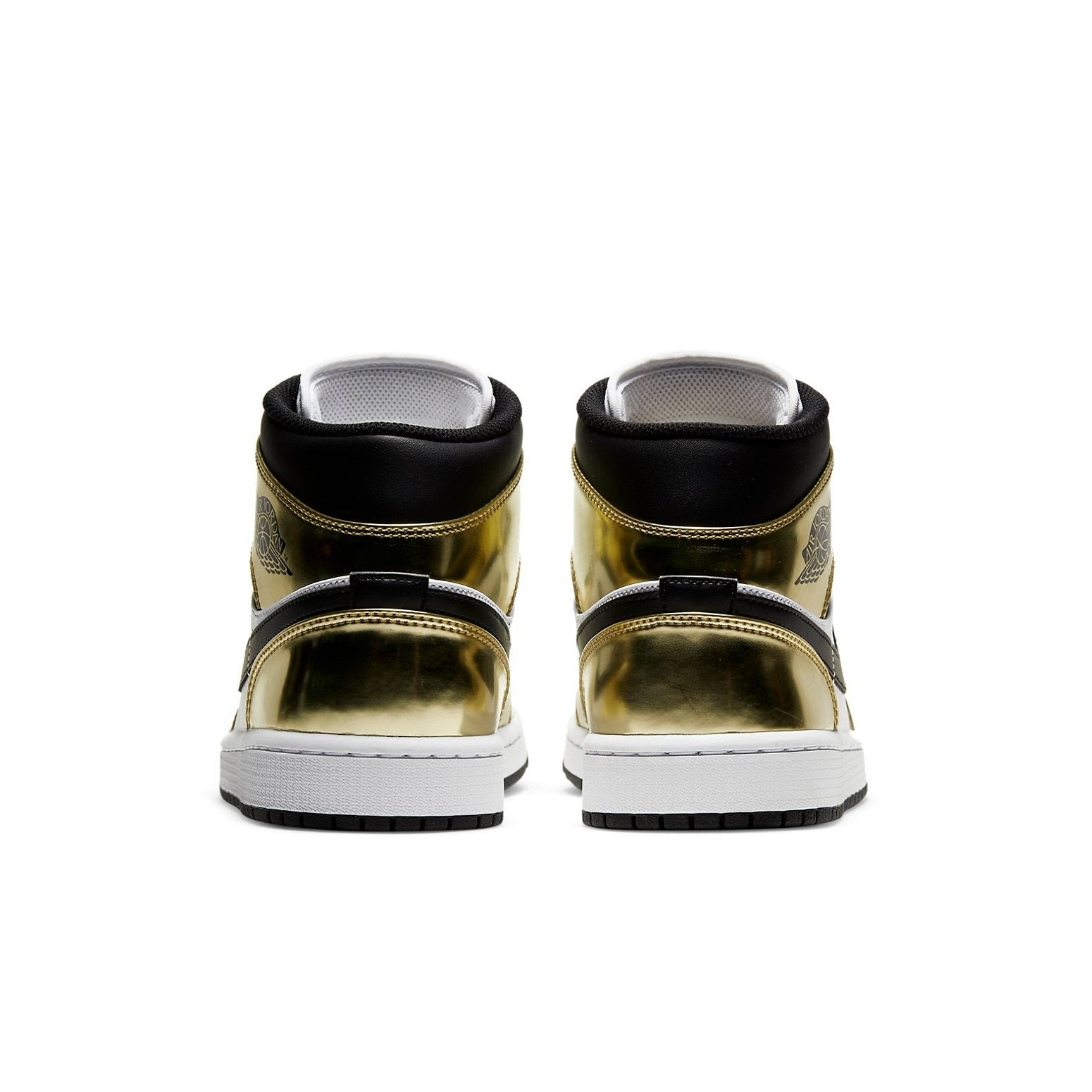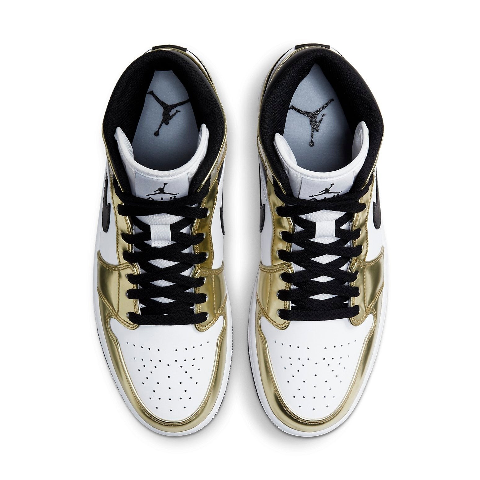 The Air Jordan 1 Mid got the golden treatment in addition to the Jordan 1 High in 2020. This Jordan Mid Metallic Gold model dons a shiny and reflective upper that is sure to make anyone take a second look at your feet.The Air Jordan 1 Mid features metallic gold overlays with a mix of smooth white leather. A quintessential Nike Swoosh in black provides a contrast to the upper. A black and white Jumpman logo appears on the tongue tag in typical Jordan Mid fashion.The Air Jordan 1 Mid Metallic Gold released in November of 2020 and retailed for $130.