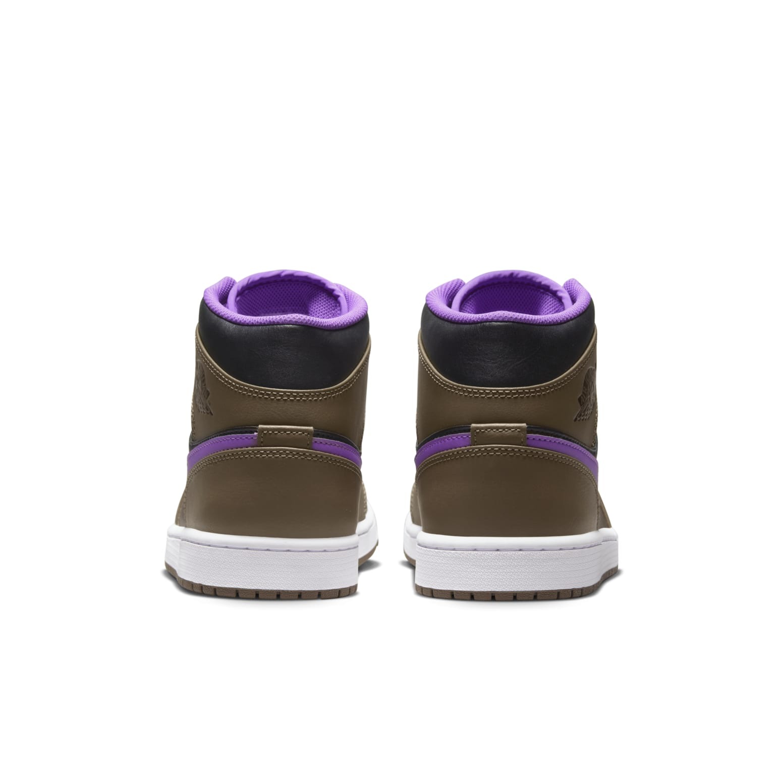 The Air Jordan 1 Mid Purple Mocha is a mid-cut offering of the Air Jordan 1 sneaker in a Purple Mocha colorway. This AJ1 offering features a leather upper with a black base and Chocolate Brown overlays. Black accents appear on the toe box, padded ankle collar, quarter panel, the Wings logo on the heel, and tongue – highlighted by Chocolate Brown on the forefoot, collar flaps, heel, and eye stays. Vibrant Violet hues on the midfoot Swooshes, tongue, laces, sock liner, and Jumpman tongue branding contrast the upper. The upper rests on a white Air-cushioned midsole and a Chocolate Brown rubber outsole. What our experts love about this Air Jordan 1 offering is its unique colorway and design. The black leather base, Chocolate Brown overlays and outsole, and violet hues on the upper add a touch of luxury design. The Air Jordan 1 Mid Purple Mocha was made available on March 1st, 2023, for a retail price of $125.