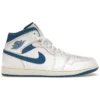 The Jordan 1 Mid SE Industrial Blue updates the legendary AJ1 silhouette with a neutral, white base and accents in Industrial Blue.This color combination gives the sneaker a vintage feel, augmented by the worn-in appearance of the Sail-colored midsole. Drawing elements from the original Air Force 1 and the Nike Dunk, this version of the Air Jordan 1 features a mid-top silhouette and a smooth leather upper. The iconic Wings logo in Industrial Blue decorates the outer side panel, while a tonal Swoosh breaks up the primarily white upper. In addition, the tongue displays the Jumpman logo, also in Industrial Blue, and the word « AIR. » The foam midsole houses comfortable air cushioning, which offers a responsive feel, while a grippy rubber outsole tops off the design.Our experts like the way this sneaker stays true to its retro roots, from the colorway to the Jordan branding. The Jordan 1 Mid SE Industrial Blue was released on April 9, 2024, and sold for $150.