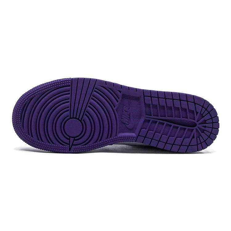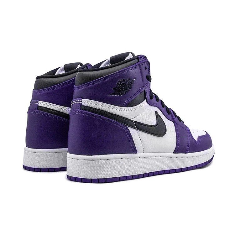 The kid-sized Air Jordan 1 Retro High Court Purple White for Grade schoolers (GS) uses the colorway Court Purple/White/Black. A black leather swoosh and purple leather overlays enhance the white tumbled leather upper with perforations in the toe box. Black laces match the black Wings logo that highlights the purple overlay on the black and white leather collar. The white padded tongue features a black patch with a purple Nike Air logo and swoosh. The midsole is white and the outsole is purple rubber with a concentric circles pattern.The kid-sized Air Jordan 1 Retro High Court Purple White GS was released on April 11, 2020, retailing at $130.